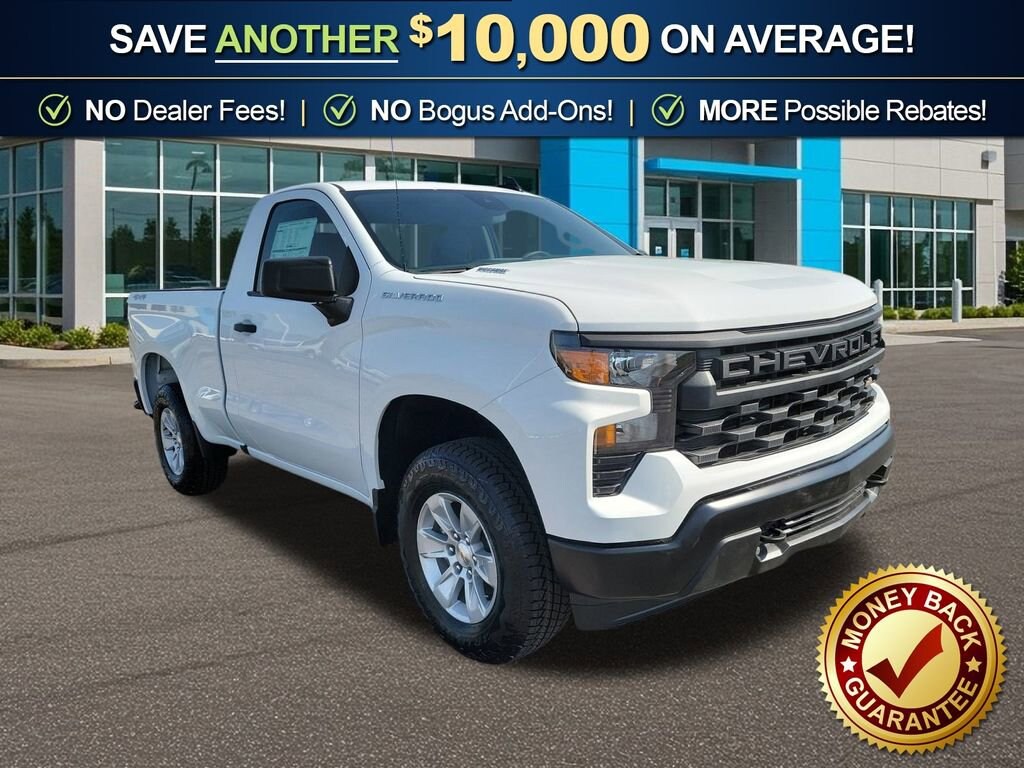 Dealer Discount of $732 off MSRP Priced below KBB Fair Purchase Price! Summit White 2025 Chevrolet Silverado 1500 WT fctp 4WD 8-Speed Automatic 2.7L I4 Turbocharged DOHC 16V LEV3-SULEV30 310hp 8-Speed Automatic, 4WD, Black Cloth, 2 Speakers, 2-Speaker Audio System, 220 Amp Alternator, 3.42 Rear Axle Ratio, 3.5 Monochromatic Display Driver Info Center, 4-Way Manual Driver Seat Adjuster, 4-Wheel Disc Brakes, 40/20/40 Front Split Bench Seat, ABS brakes, Air Conditioning, Apple CarPlay/Android Auto, Auto High-beam Headlights, Automatic Emergency Braking, Black (Semi-Gloss) Front Bumper, Black (Semi-Gloss) Rear Bumper, Bluetooth® For Phone, Brake assist, Chevytec Spray-On Black Bedliner, Compass, Deep-Tinted Glass, Delay-off headlights, Driver door bin, Dual front impact airbags, Dual front side impact airbags, Electric Rear-Window Defogger, Electronic Cruise Control, Electronic Stability Control, Emergency communication system: OnStar, Following Distance Indicator, Forward Collision Alert, Front anti-roll bar, Front Center Armrest w/Storage, Front Frame-Mounted Black Recovery Hooks, Front Pedestrian Braking, Front reading lights, Front wheel independent suspension, Fully automatic headlights, HD Rear Vision Camera, Heated door mirrors, Heated Power-Adjustable Outside Mirrors, Heavy-Duty Air Filter, Hitch Guidance, Illuminated entry, Inside Rear-View Mirror w/Tilt, IntelliBeam Automatic High Beam On/Off, Lane Keep Assist w/Lane Departure Warning, Locking Tailgate, Low tire pressure warning, Manual Tailgate Function w/No EZ Lift, Manual Tilt Wheel Steering Column, Occupant sensing airbag, OnStar Services Capable, Outside temperature display, Overhead airbag, Overhead console, Panic alarm, Passenger door bin, Passenger vanity mirror, Power door mirrors, Power Front Windows w/Driver Express Up/Down, Power Front Windows w/Passenger Express Down, Power steering, Power windows, Preferred Equipment Group 1WT, Premium audio system: Chevrolet Infotainment 3, Radio data system, Radio: Chevrolet Infotainment 3 System, Rear reading lights, Rear step bumper, Remote Keyless Entry, Remote keyless entry, Rubberized-Vinyl Floor Covering, SiriusXM Delete, Solar Absorbing Tinted Glass, Speed control, Speed-sensing steering, Standard Suspension Package, Standard Tailgate, Tachometer, Teen Driver, Tilt steering wheel, Tire Pressure Monitoring System, Traction control, Trailering Package, Trip computer, Variably intermittent wipers, Vinyl Seat Trim, Voltmeter, Wheels: 17 x 8 Bright Silver Painted Aluminum, Wheels: 17 x 8 Ultra Silver Painted Steel, Wi-Fi Hot Spot Capable, Work Truck Package, WT Convenience Package, WT Value Package, 8-Speed Automatic, 4WD, Black Cloth. Price includes: $1000 - GM Bonus Cash. Exp. 03/02/2026 $3000 - Chevrolet Consumer Cash Program. Exp. 03/02/2026