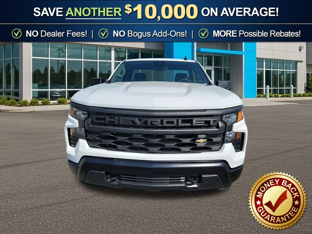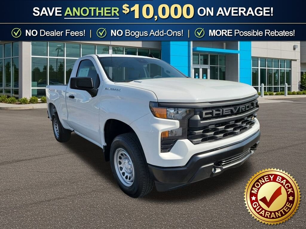 Dealer Discount of $2,748 off MSRP Priced below KBB Fair Purchase Price! Summit White 2025 Chevrolet Silverado 1500 WT NCT 4WD 8-Speed Automatic 2.7L I4 Turbocharged DOHC 16V LEV3-SULEV30 310hp 8-Speed Automatic, 4WD, Jet Black Vinyl, 2 Speakers, 2-Speaker Audio System, 220 Amp Alternator, 3.42 Rear Axle Ratio, 3.5 Monochromatic Display Driver Info Center, 4-Way Manual Driver Seat Adjuster, 4-Wheel Disc Brakes, 40/20/40 Front Split Bench Seat, ABS brakes, Air Conditioning, Apple CarPlay/Android Auto, Auto High-beam Headlights, Auto-Locking Rear Differential, Automatic Emergency Braking, Black (Semi-Gloss) Front Bumper, Black (Semi-Gloss) Rear Bumper, Bluetooth® For Phone, Brake assist, Chevytec Spray-On Black Bedliner, Compass, Deep-Tinted Glass, Delay-off headlights, Driver door bin, Dual front impact airbags, Dual front side impact airbags, Electronic Cruise Control, Electronic Stability Control, Emergency communication system: OnStar, Following Distance Indicator, Forward Collision Alert, Front anti-roll bar, Front Center Armrest w/Storage, Front Frame-Mounted Black Recovery Hooks, Front License Plate Kit, Front Pedestrian Braking, Front reading lights, Front wheel independent suspension, Fully automatic headlights, HD Rear Vision Camera, Heated door mirrors, Heated Power-Adjustable Outside Mirrors, Hitch Guidance, Illuminated entry, Inside Rear-View Mirror w/Tilt, Integrated Trailer Brake Controller, IntelliBeam Automatic High Beam On/Off, Lane Keep Assist w/Lane Departure Warning, LED Cargo Area Lighting, Locking Tailgate, Low tire pressure warning, Manual Tailgate Function w/No EZ Lift, Manual Tilt Wheel Steering Column, Occupant sensing airbag, OnStar Services Capable, Outside temperature display, Overhead airbag, Overhead console, Panic alarm, Passenger door bin, Passenger vanity mirror, Power door mirrors, Power Front Windows w/Driver Express Up/Down, Power Front Windows w/Passenger Express Down, Power steering, Power windows, Preferred Equipment Group 1WT, Premium audio system: Chevrolet Infotainment 3, Radio data system, Radio: Chevrolet Infotainment 3 System, Rear reading lights, Rear step bumper, Remote Keyless Entry, Remote keyless entry, Rubberized-Vinyl Floor Covering, SiriusXM Delete, Solar Absorbing Tinted Glass, Speed control, Speed-sensing steering, Standard Suspension Package, Standard Tailgate, Tachometer, Teen Driver, Tilt steering wheel, Tire Pressure Monitoring System, Traction control, Trailering Package, Trip computer, Variably intermittent wipers, Vinyl Seat Trim, Voltmeter, Wheels: 17 x 8 Ultra Silver Painted Steel, Wi-Fi Hot Spot Capable, 8-Speed Automatic, 4WD, Jet Black Vinyl. Price includes: $1000 - GM Bonus Cash. Exp. 03/02/2026 $3000 - Chevrolet Consumer Cash Program. Exp. 03/02/2026