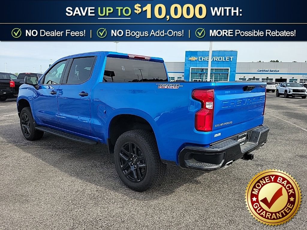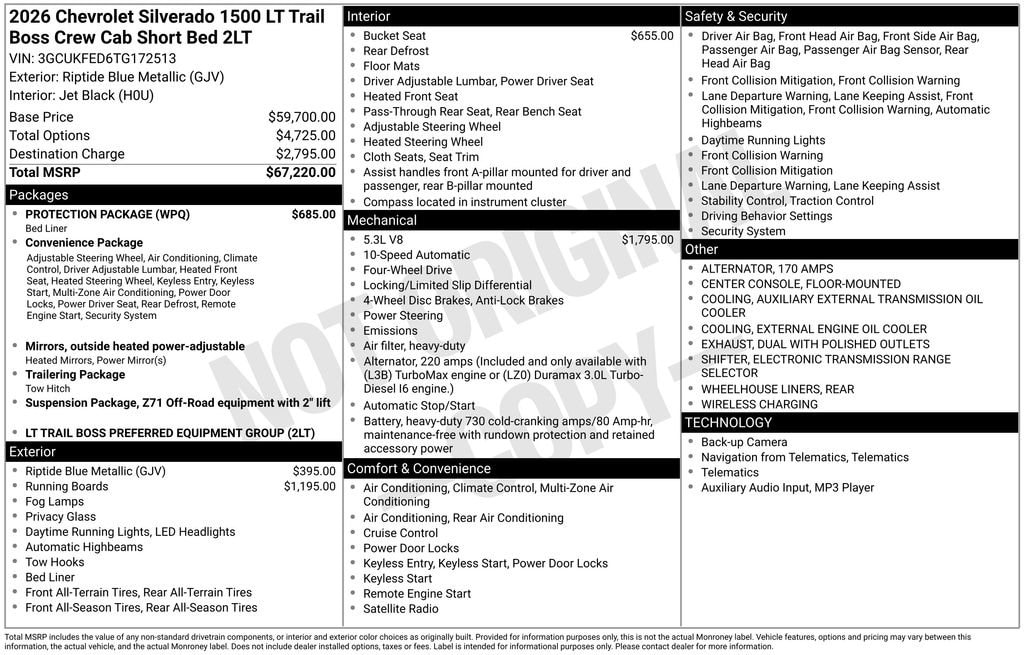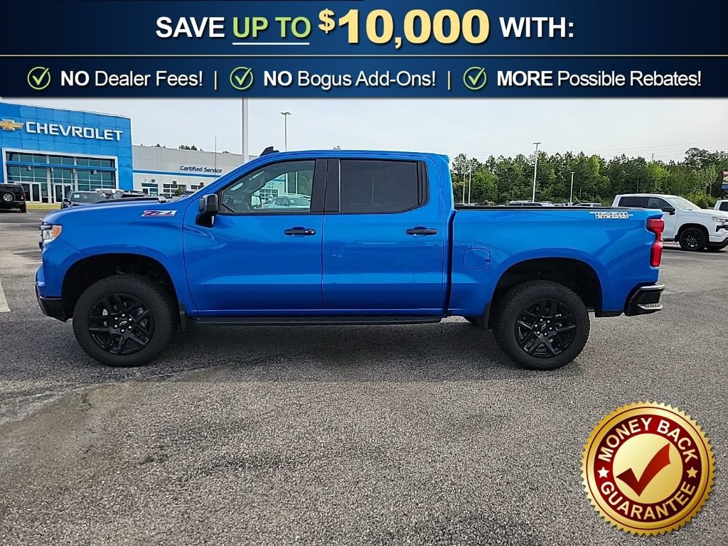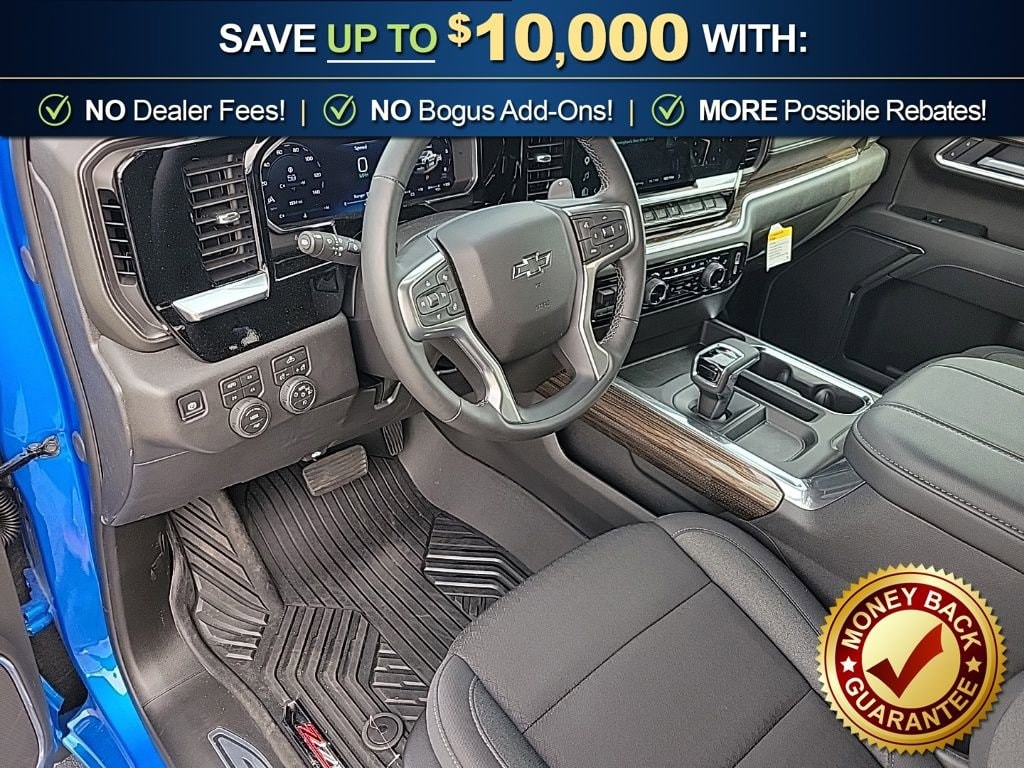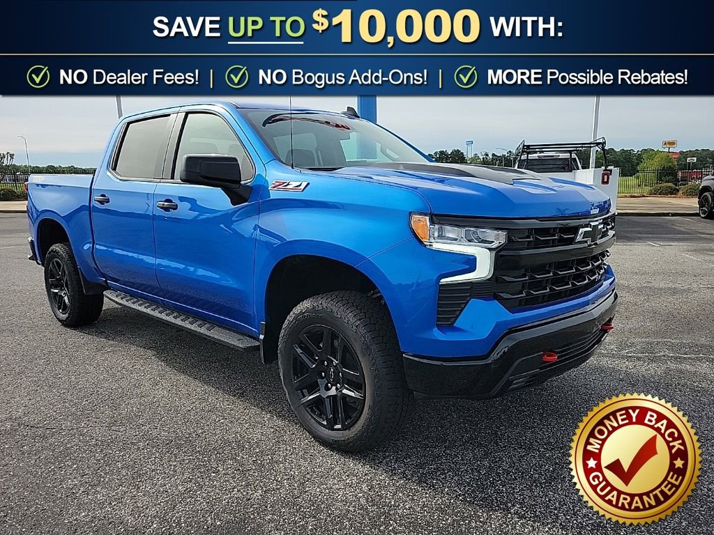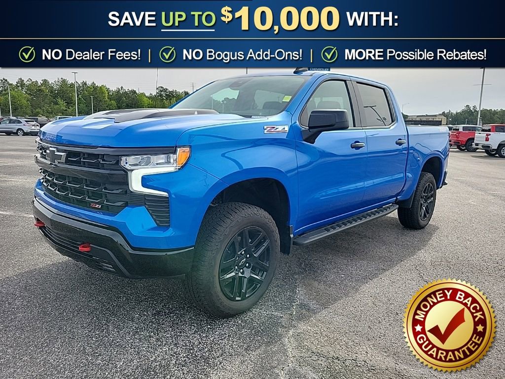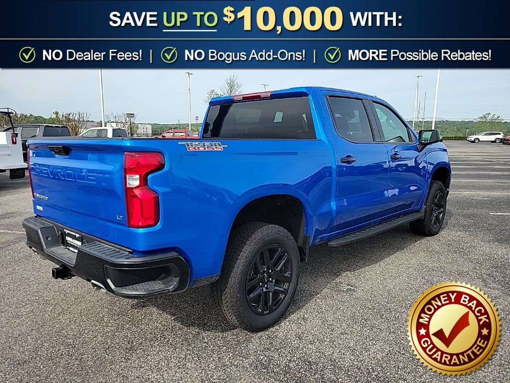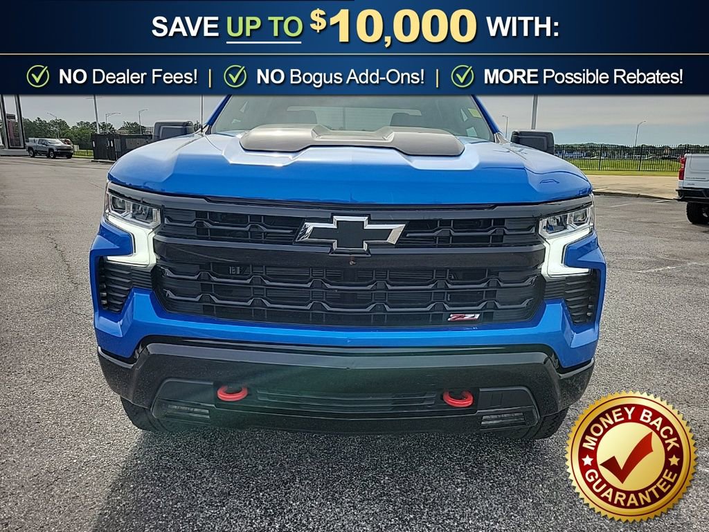 Dealer Discount of $4,871 off MSRP Priced below KBB Fair Purchase Price! Riptide Blue Metallic 2026 Chevrolet Silverado 1500 LT Trail Boss fctp 4WD 10-Speed Automatic EcoTec3 5.3L V8 10-Speed Automatic, 4WD, Black Cloth, 10-Way Power Driver Seat with Lumbar, 12.3 Multicolor Reconfigurable Digital Display, 120-Volt Bed Mounted Power Outlet, 120-Volt Interior Power Outlet, 170 Amp Alternator, 2 USB Data Ports, 220 Amp Alternator, 4-Wheel Disc Brakes, 40/20/40 Front Split-Bench Seat, 6 Speakers, 6-Speaker Audio System, ABS brakes, Air Conditioning, All-Weather Floor Liner, Alloy wheels, AM/FM radio: SiriusXM with 360L, Apple CarPlay/Android Auto, Auto High-beam Headlights, Auto-Locking Rear Differential, Automatic Emergency Braking, Automatic temperature control, Auxiliary External Transmission Oil Cooler, Bluetooth® For Phone, Brake assist, Chevytec Spray-on Black Bedliner, Cloth Seat Trim, Color-Keyed Carpeting Floor Covering, Compass, Convenience Package, Deep-Tinted Glass, Delay-off headlights, Driver door bin, Driver vanity mirror, Dual Exhaust with Polished Outlets, Dual front impact airbags, Dual front side impact airbags, Dual Rear USB Ports (charge Only), Dual-Zone Automatic Climate Control, Electric Rear-Window Defogger, Electronic Cruise Control, Electronic Stability Control, Electronic Transmission Range Selector Shifter, Emergency communication system: OnStar, External Engine Oil Cooler, EZ Lift Power Lock and Release Tailgate, Floor Mounted Center Console, Following Distance Indicator, Forward Collision Alert, Front anti-roll bar, Front Bucket Seats, Front Center Armrest w/Storage, Front dual zone A/C, Front fog lights, Front LED Fog Lamps, Front Pedestrian Braking, Front reading lights, Front wheel independent suspension, Fully automatic headlights, HD Rear Vision Camera, Heated door mirrors, Heated Driver and Front Outboard Passenger Seats, Heated front seats, Heated Power-Adjustable Outside Mirrors, Heated Steering Wheel, Heated steering wheel, Heavy-Duty Air Filter, High Gloss Black Mirror Caps, Hill Descent Control, Hitch Guidance, Illuminated entry, Inside Rearview Mirror with Tilt, Integrated Trailer Brake Controller, IntelliBeam Automatic High Beam on/Off, Keyless Open and Start, Lane Keep Assist with Lane Departure Warning, LED Cargo Area Lighting, Low tire pressure warning, Manual Tilt/Telescoping Steering Column, Occupant sensing airbag, Off-Road High Clearance Steps, OnStar Services Capable, Outside temperature display, Overhead airbag, Overhead console, Panic alarm, Passenger door bin, Passenger vanity mirror, Performance Red Recovery Hooks, Power door mirrors, Power driver seat, Power Front Windows with Driver Express Up/Down, Power Front Windows with Passenger Express Down, Power Rear Windows with Express Down, Power steering, Power windows, Preferred Equipment Group 2LT, Premium audio system: Chevrolet Infotainment 3 Premium, Protection Package, Radio data system, Radio: Chevrolet Infotainment 3 Premium System, Rear 60/40 Folding Bench Seat (folds Up), Rear reading lights, Rear step bumper, Rear Wheelhouse Liners, Rear window defroster, Remote keyless entry, Remote Vehicle Starter System, Security system, Single Outlet Exhaust, SiriusXM with 360L Trial Subscription, Speed control, Speed-sensing steering, Split folding rear seat, Standard Tailgate, Steering Wheel Audio Controls, Steering wheel mounted audio controls, Suspension Package, Tachometer, Teen Driver, Telescoping steering wheel, Theft Deterrent System (unauthorized Entry), Tilt steering wheel, Tire Pressure Monitoring System, Traction control, Trailering Package, Trip computer, Variably intermittent wipers, Voltmeter, Wheels: 20 x 9 High Gloss Black Painted Aluminum, Wi-Fi Hot Spot Capable, Wireless Charging, Wrapped Steering Wheel, 10-Speed Automatic, 4WD, Black Cloth. Price includes: $4250 - Chevrolet Consumer Cash Program. Exp. 04/30/2026 $500 - Chevrolet Bonus Cash. Exp. 04/30/2026