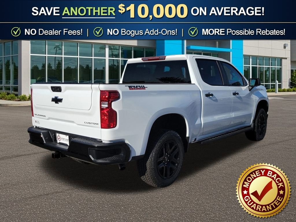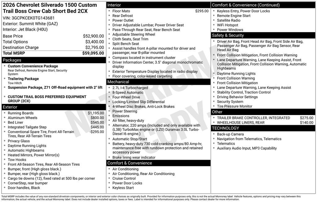 Dealer Discount of $3,590 off MSRP Priced below KBB Fair Purchase Price! Summit White 2026 Chevrolet Silverado 1500 Custom Trail Boss fctp 4WD 8-Speed Automatic 2.7L I4 Turbocharged DOHC 16V LEV3-SULEV30 310hp 8-Speed Automatic, 4WD, Black Cloth, 10-Way Power Driver Seat with Lumbar, 120-Volt Bed Mounted Power Outlet, 120-Volt Interior Power Outlet, 220 Amp Alternator, 3.42 Rear Axle Ratio, 3.5 Monochromatic Display Driver Info Center, 4-Wheel Disc Brakes, 40/20/40 Front Split-Bench Seat, 6 Speakers, 6-Speaker Audio System, ABS brakes, Air Conditioning, All-Weather Floor Liner, Alloy wheels, AM/FM radio: SiriusXM, Apple CarPlay/Android Auto, Auto High-beam Headlights, Auto-Locking Rear Differential, Automatic Emergency Braking, Bluetooth® For Phone, Brake assist, Chevytec Spray-on Black Bedliner, Cloth Seat Trim, Color-Keyed Carpeting Floor Covering, Compass, Custom Convenience Package, Deep-Tinted Glass, Delay-off headlights, Driver door bin, Driver vanity mirror, Dual front impact airbags, Dual front side impact airbags, Dual Rear USB Ports (charge Only), Electric Rear-Window Defogger, Electronic Cruise Control, Electronic Stability Control, Emergency communication system: OnStar, EZ Lift Power Lock and Release Tailgate, Following Distance Indicator, Forward Collision Alert, Front anti-roll bar, Front Center Armrest w/Storage, Front Pedestrian Braking, Front reading lights, Front Rubberized Vinyl Floor Mats, Front wheel independent suspension, Fully automatic headlights, HD Rear Vision Camera, Heated door mirrors, Heavy-Duty Air Filter, Hill Descent Control, Hitch Guidance, Illuminated entry, Integrated Trailer Brake Controller, IntelliBeam Automatic High Beam on/Off, Lane Keep Assist with Lane Departure Warning, LED Cargo Area Lighting, Low tire pressure warning, Manual Tilt Wheel Steering Column, Multi-Flex Tailgate, Occupant sensing airbag, Off-Road High Clearance Steps, OnStar Services Capable, Outside temperature display, Overhead airbag, Overhead console, Panic alarm, Passenger door bin, Passenger vanity mirror, Performance Red Recovery Hooks, Power door mirrors, Power driver seat, Power Front Windows with Driver Express Up/Down, Power Front Windows with Passenger Express Down, Power Rear Windows with Express Down, Power steering, Power windows, Preferred Equipment Group 2CX, Premium audio system: Chevrolet Infotainment 3, Radio data system, Radio: Chevrolet Infotainment 3 System, Rear 60/40 Folding Bench Seat (folds Up), Rear reading lights, Rear Rubberized-Vinyl Floor Mats, Rear step bumper, Rear Wheelhouse Liners, Rear window defroster, Remote Keyless Entry, Remote keyless entry, Remote Vehicle Starter System, Security system, Single Outlet Exhaust, SiriusXM Trial Subscription, Speed control, Speed-sensing steering, Split folding rear seat, Standard Tailgate, Suspension Package, Tachometer, Teen Driver, Theft Deterrent System (unauthorized Entry), Tilt steering wheel, Tire Pressure Monitoring System, Traction control, Trailering Package, Trip computer, Variably intermittent wipers, Voltmeter, Wheels: 18 x 8.5 Black Painted Aluminum, Wheels: 20 x 9 High Gloss Black Painted Aluminum, Wi-Fi Hot Spot Capable, 8-Speed Automatic, 4WD, Black Cloth. Price includes: $1000 - Chevrolet Select Market Bonus Cash. Exp. 03/31/2026 $3000 - Chevrolet Consumer Cash Program. Exp. 03/31/2026