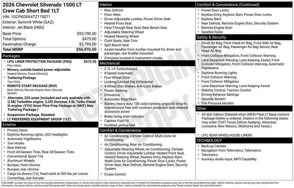 Dealer Discount of $3,860 off MSRP Priced below KBB Fair Purchase Price! Summit White 2026 Chevrolet Silverado 1500 LT fctp 4WD 8-Speed Automatic 2.7L I4 Turbocharged DOHC 16V LEV3-SULEV30 310hp 8-Speed Automatic, 4WD, Black Cloth, 10-Way Power Driver Seat with Lumbar, 12.3 Multicolor Reconfigurable Digital Display, 120-Volt Bed Mounted Power Outlet, 120-Volt Interior Power Outlet, 3.42 Rear Axle Ratio, 4-Wheel Disc Brakes, 40/20/40 Front Split-Bench Seat, 6 Speakers, 6-Speaker Audio System, ABS brakes, Air Conditioning, All-Star Edition, Alloy wheels, AM/FM radio: SiriusXM with 360L, Apple CarPlay/Android Auto, Auto High-beam Headlights, Auto-Locking Rear Differential, Automatic Emergency Braking, Automatic temperature control, Bluetooth® For Phone, Brake assist, Bumpers: chrome, Chrome Mirror Caps, Cloth Seat Trim, Color-Keyed Carpeting Floor Covering, Compass, Convenience Package, Deep-Tinted Glass, Delay-off headlights, Driver door bin, Driver vanity mirror, Dual front impact airbags, Dual front side impact airbags, Dual Rear USB Ports (charge Only), Dual-Zone Automatic Climate Control, Electric Rear-Window Defogger, Electronic Cruise Control, Electronic Stability Control, Emergency communication system: OnStar, Following Distance Indicator, Forward Collision Alert, Front anti-roll bar, Front Center Armrest w/Storage, Front dual zone A/C, Front Frame-Mounted Black Recovery Hooks, Front Pedestrian Braking, Front reading lights, Front wheel independent suspension, Fully automatic headlights, HD Rear Vision Camera, Heated door mirrors, Heated Driver and Front Outboard Passenger Seats, Heated front seats, Heated Steering Wheel, Heated steering wheel, Hitch Guidance, Illuminated entry, Integrated Trailer Brake Controller, IntelliBeam Automatic High Beam on/Off, Keyless Open and Start, Lane Keep Assist with Lane Departure Warning, LED Cargo Area Lighting, Low tire pressure warning, Manual Tilt/Telescoping Steering Column, Occupant sensing airbag, OnStar Services Capable, Outside temperature display, Overhead airbag, Overhead console, Panic alarm, Passenger door bin, Passenger vanity mirror, Power door mirrors, Power driver seat, Power Front Windows with Driver Express Up/Down, Power Front Windows with Passenger Express Down, Power Rear Windows with Express Down, Power steering, Power windows, Premium audio system: Chevrolet Infotainment 3 Premium, Radio data system, Radio: Chevrolet Infotainment 3 Premium System, Rear 60/40 Folding Bench Seat (folds Up), Rear reading lights, Rear step bumper, Rear window defroster, Remote keyless entry, Remote Vehicle Starter System, Security system, SiriusXM with 360L Trial Subscription, Speed control, Speed-sensing steering, Split folding rear seat, Standard Suspension Package, Steering Wheel Audio Controls, Steering wheel mounted audio controls, Tachometer, Teen Driver, Telescoping steering wheel, Theft Deterrent System (unauthorized Entry), Tilt steering wheel, Tire Pressure Monitoring System, Traction control, Trailering Package, Trip computer, Variably intermittent wipers, Voltmeter, Wheels: 18 x 8.5 Bright Silver Painted Aluminum, Wi-Fi Hot Spot Capable, Wrapped Steering Wheel, 8-Speed Automatic, 4WD, Black Cloth. Price includes: $1000 - Chevrolet Select Market Bonus Cash. Exp. 03/31/2026 $3000 - Chevrolet Consumer Cash Program. Exp. 03/31/2026