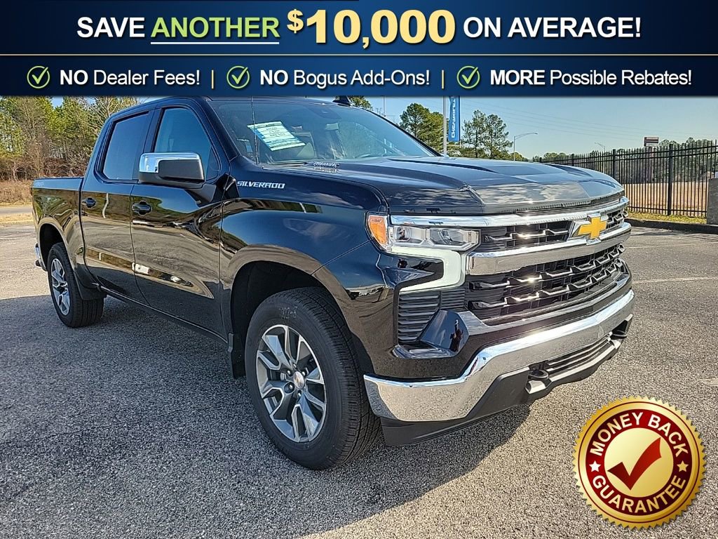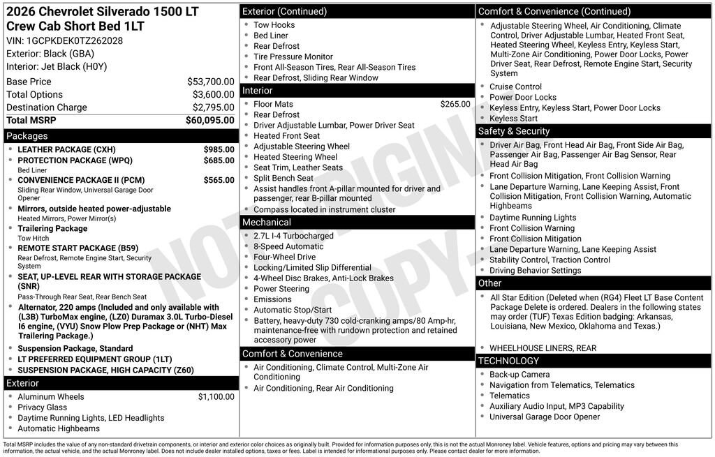 Dealer Discount of $4,194 off MSRP Priced below KBB Fair Purchase Price! Black 2026 Chevrolet Silverado 1500 LT fctp 4WD 8-Speed Automatic 2.7L I4 Turbocharged DOHC 16V LEV3-SULEV30 310hp 8-Speed Automatic, 4WD, Black Leather, 12.3 Multicolor Reconfigurable Digital Display, 120-Volt Bed Mounted Power Outlet, 120-Volt Interior Power Outlet, 3.42 Rear Axle Ratio, 4-Wheel Disc Brakes, 40/20/40 Front Split-Bench Seat, 6 Speakers, 6-Speaker Audio System, ABS brakes, Air Conditioning, All-Star Edition, Alloy wheels, AM/FM radio: SiriusXM with 360L, Apple CarPlay/Android Auto, Auto High-beam Headlights, Auto-Locking Rear Differential, Automatic Emergency Braking, Automatic temperature control, Bluetooth® For Phone, Brake assist, Bumpers: chrome, Chrome Mirror Caps, Cloth Seat Trim, Color-Keyed Carpeting Floor Covering, Compass, Convenience Package, Deep-Tinted Glass, Delay-off headlights, Driver door bin, Driver vanity mirror, Dual front impact airbags, Dual front side impact airbags, Dual-Zone Automatic Climate Control, Electric Rear-Window Defogger, Electronic Cruise Control, Electronic Stability Control, Emergency communication system: OnStar, Following Distance Indicator, Forward Collision Alert, Front anti-roll bar, Front Center Armrest w/Storage, Front dual zone A/C, Front Frame-Mounted Black Recovery Hooks, Front Pedestrian Braking, Front reading lights, Front wheel independent suspension, Fully automatic headlights, HD Rear Vision Camera, Heated door mirrors, Heated front seats, Heated Steering Wheel, Heated steering wheel, High Capacity Suspension Package, Hitch Guidance, Illuminated entry, Integrated Trailer Brake Controller, LED Cargo Area Lighting, Low tire pressure warning, Manual Tilt/Telescoping Steering Column, Occupant sensing airbag, OnStar Services Capable, Outside temperature display, Overhead airbag, Overhead console, Panic alarm, Passenger door bin, Passenger vanity mirror, Power door mirrors, Power driver seat, Power steering, Power windows, Premium audio system: Chevrolet Infotainment 3 Premium, Radio data system, Radio: Chevrolet Infotainment 3 Premium System, Rear reading lights, Rear step bumper, Rear window defroster, Remote keyless entry, Remote Vehicle Starter System, Security system, Speed control, Speed-sensing steering, Split folding rear seat, Standard Suspension Package, Steering Wheel Audio Controls, Steering wheel mounted audio controls, Tachometer, Teen Driver, Telescoping steering wheel, Tilt steering wheel, Tire Pressure Monitoring System, Traction control, Trailering Package, Trip computer, Variably intermittent wipers, Voltmeter, Wheels: 18 x 8.5 Bright Silver Painted Aluminum, Wheels: 20 x 9 Painted Aluminum, Wi-Fi Hot Spot Capable, Wrapped Steering Wheel, 8-Speed Automatic, 4WD, Black Leather. Price includes: $1000 - Chevrolet Select Market Bonus Cash. Exp. 03/31/2026 $3000 - Chevrolet Consumer Cash Program. Exp. 03/31/2026