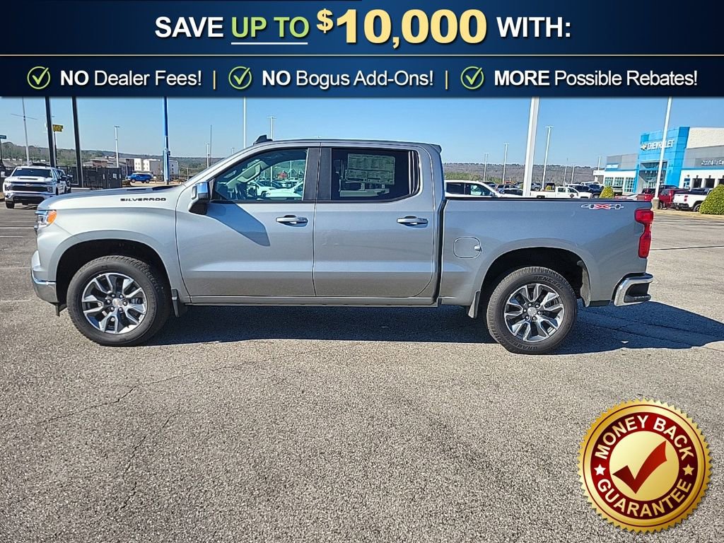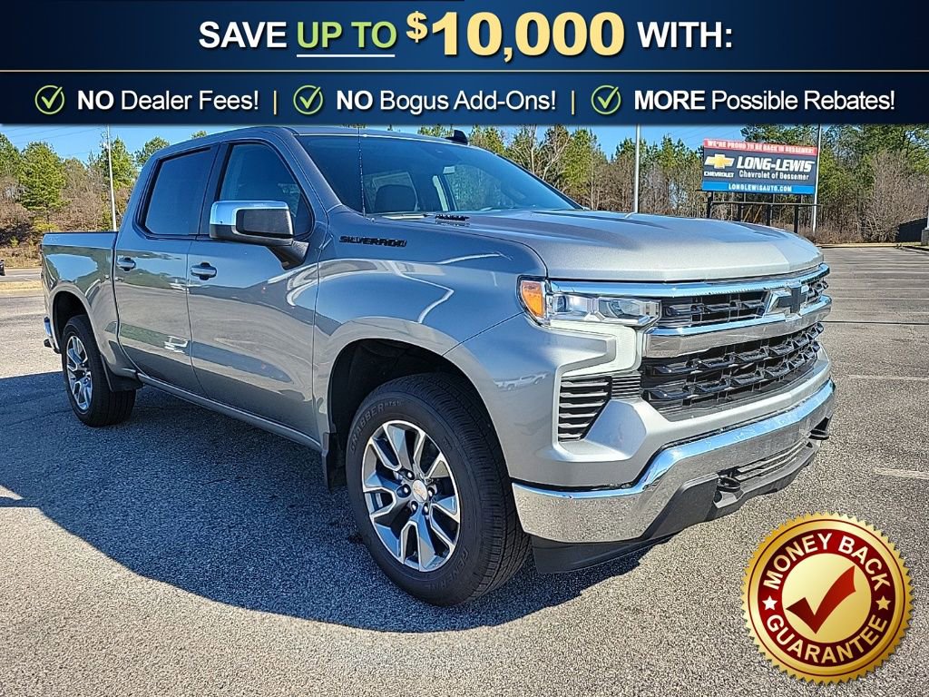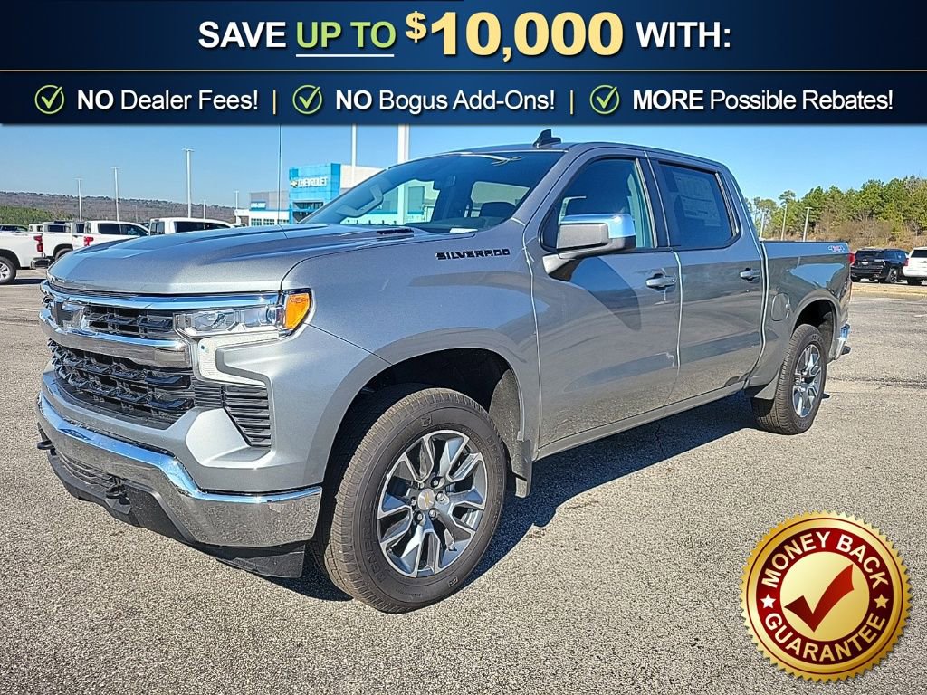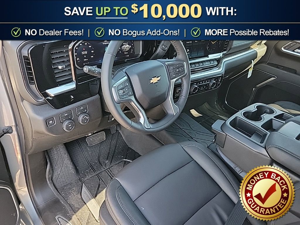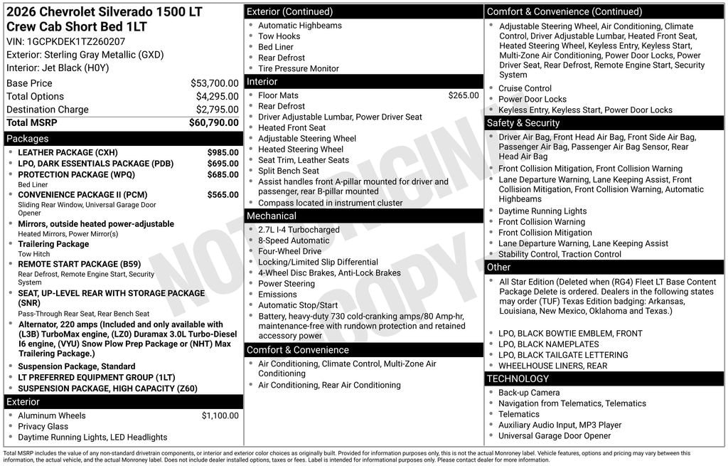 Dealer Discount of $4,252 off MSRP Sterling Gray Metallic 2026 Chevrolet Silverado 1500 LT fctp 4WD 8-Speed Automatic 2.7L I4 Turbocharged DOHC 16V LEV3-SULEV30 310hp 8-Speed Automatic, 4WD, Black Leather, 12.3 Multicolor Reconfigurable Digital Display, 120-Volt Bed Mounted Power Outlet, 120-Volt Interior Power Outlet, 3.42 Rear Axle Ratio, 4-Wheel Disc Brakes, 40/20/40 Front Split-Bench Seat, 6 Speakers, 6-Speaker Audio System, ABS brakes, Air Conditioning, All-Star Edition, Alloy wheels, AM/FM radio: SiriusXM with 360L, Apple CarPlay/Android Auto, Auto High-beam Headlights, Auto-Locking Rear Differential, Automatic Emergency Braking, Automatic temperature control, Bluetooth® For Phone, Brake assist, Bumpers: chrome, Chrome Mirror Caps, Cloth Seat Trim, Color-Keyed Carpeting Floor Covering, Compass, Convenience Package, Deep-Tinted Glass, Delay-off headlights, Driver door bin, Driver vanity mirror, Dual front impact airbags, Dual front side impact airbags, Dual-Zone Automatic Climate Control, Electric Rear-Window Defogger, Electronic Cruise Control, Electronic Stability Control, Emergency communication system: OnStar, Following Distance Indicator, Forward Collision Alert, Front anti-roll bar, Front Center Armrest w/Storage, Front dual zone A/C, Front Frame-Mounted Black Recovery Hooks, Front Pedestrian Braking, Front reading lights, Front wheel independent suspension, Fully automatic headlights, HD Rear Vision Camera, Heated door mirrors, Heated front seats, Heated Steering Wheel, Heated steering wheel, High Capacity Suspension Package, Hitch Guidance, Illuminated entry, Integrated Trailer Brake Controller, LED Cargo Area Lighting, Low tire pressure warning, Manual Tilt/Telescoping Steering Column, Occupant sensing airbag, OnStar Services Capable, Outside temperature display, Overhead airbag, Overhead console, Panic alarm, Passenger door bin, Passenger vanity mirror, Power door mirrors, Power driver seat, Power steering, Power windows, Premium audio system: Chevrolet Infotainment 3 Premium, Radio data system, Radio: Chevrolet Infotainment 3 Premium System, Rear reading lights, Rear step bumper, Rear window defroster, Remote keyless entry, Remote Vehicle Starter System, Security system, Speed control, Speed-sensing steering, Split folding rear seat, Standard Suspension Package, Steering Wheel Audio Controls, Steering wheel mounted audio controls, Tachometer, Teen Driver, Telescoping steering wheel, Tilt steering wheel, Tire Pressure Monitoring System, Traction control, Trailering Package, Trip computer, Variably intermittent wipers, Voltmeter, Wheels: 18 x 8.5 Bright Silver Painted Aluminum, Wheels: 20 x 9 Painted Aluminum, Wi-Fi Hot Spot Capable, Wrapped Steering Wheel, 8-Speed Automatic, 4WD, Black Leather. Price includes: $1000 - Chevrolet Select Market Bonus Cash. Exp. 04/30/2026 $2000 - Chevrolet Consumer Cash Program. Exp. 04/30/2026