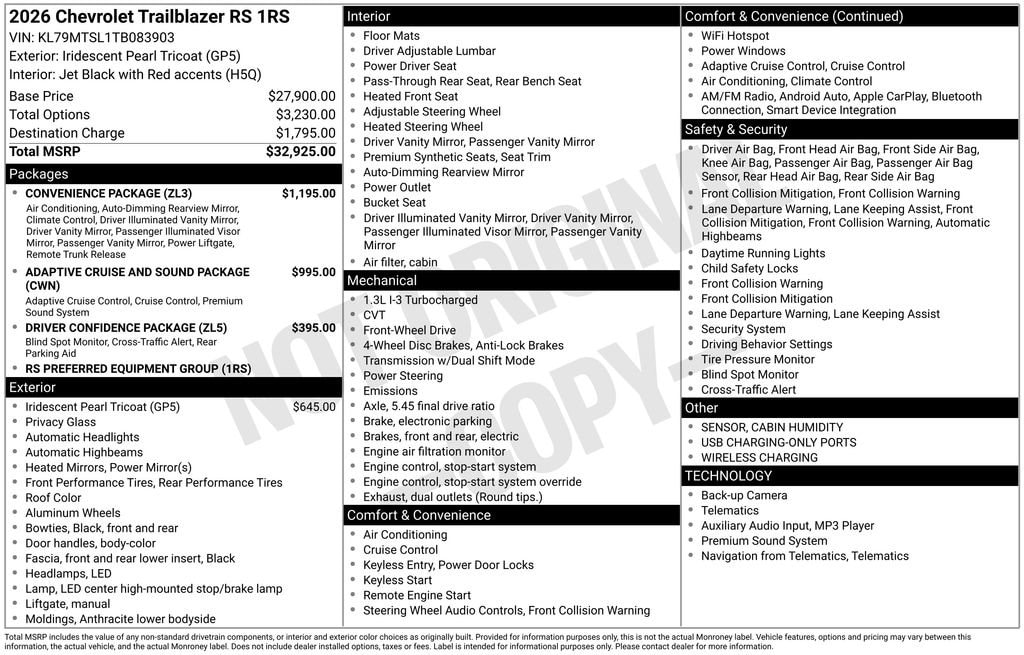 The optimal mix of performance and efficiency! A turbocharger further enhances performance, while also preserving fuel economy. Chevrolet prioritized fit and finish as evidenced by: adjustable headrests in all seating positions, remote keyless entry, and much more. Smooth gearshifts are achieved thanks to the efficient 3 cylinder engine, and for added security, dynamic Stability Control supplements the drivetrain.