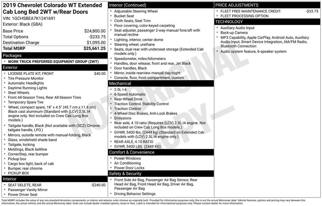 2019 Chevrolet Colorado Work Truck Black Work Truck RWD 6-Speed Automatic 2.5L I4 DI DOHC VVT 4-Wheel Disc Brakes, 4.10 Rear Axle Ratio, 6 Speakers, 6-Speaker Audio System Feature, ABS brakes, Air Conditioning, AM/FM radio, Apple CarPlay/Android Auto, Bumpers: body-color, Cloth Seat Trim, Delay-off headlights, Driver 4-Way Power Seat Adjuster, Driver door bin, Dual front impact airbags, Dual front side impact airbags, Electronic Stability Control, Exterior Parking Camera Rear, Front anti-roll bar, Front Bucket Seats, Front Center Armrest, Front License Plate Kit, Front wheel independent suspension, Full-Length Black Vinyl Floor Covering, Fully automatic headlights, Low tire pressure warning, Occupant sensing airbag, Overhead airbag, Passenger door bin, Passenger vanity mirror, Power driver seat, Power steering, Power windows, Preferred Equipment Group 2WT, Premium audio system: Chevrolet Infotainment System, Radio data system, Radio: Chevrolet Infotainment 3 System, Rear step bumper, Speed-sensing steering, Split folding rear seat, Tachometer, Tilt steering wheel, Traction control, Trip computer, Variably intermittent wipers, Wheels: 16 x 7 Ultra Silver Metallic Steel.Recent Arrival! Odometer is 29680 miles below market average! 20/26 City/Highway MPGAwards:* 2019 KBB.com Best Resale Value Awards