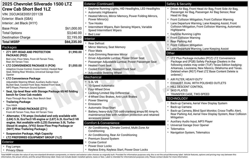 2025 Chevrolet Silverado 1500 LTZ Black LTZ 4WD 10-Speed Automatic EcoTec3 5.3L V8 10-Speed Automatic, 4WD, Black Leather, 10-Way Power Driver Seat w/Lumbar, 10-Way Power Passenger Seat Adjuster w/Lumbar, 12.3 Multicolor Reconfigurable Digital Display, 120-Volt Bed Mounted Power Outlet, 120-Volt Interior Power Outlet, 170 Amp Alternator, 2 USB Data Ports, 2nd Row Heated Outboard Seats, 3.23 Rear Axle Ratio, 4-Wheel Disc Brakes, 7 Speakers, ABS brakes, Adaptive Cruise Control, Air Conditioning, All-Weather Floor Liner (LPO) (AAK), Alloy wheels, AM/FM radio: SiriusXM with 360L, Apple CarPlay/Android Auto, Auto High-beam Headlights, Auto-dimming door mirrors, Auto-Dimming Inside Rear-View Mirror, Auto-dimming Rear-View mirror, Auto-Locking Rear Differential, Automatic Emergency Braking, Automatic temperature control, Bluetooth® For Phone, Brake assist, Bumpers: chrome, Chevytec Spray-On Black Bedliner, Chrome Mirror Caps, Color-Keyed Carpeting Floor Covering, Compass, Deep-Tinted Glass, Delay-off headlights, Driver door bin, Driver Memory, Driver vanity mirror, Dual Exhaust w/Polished Outlets, Dual front impact airbags, Dual front side impact airbags, Dual Rear USB Ports (Charge Only), Electric Rear-Window Defogger, Electronic Cruise Control, Electronic Stability Control, Electronic Transmission Range Selector Shifter, Emergency communication system: OnStar, Floor Mounted Center Console, Following Distance Indicator, Forward Collision Alert, Front anti-roll bar, Front Bucket Seats, Front Center Armrest, Front dual zone A/C, Front fog lights, Front Frame-Mounted Black Recovery Hooks, Front LED Fog Lamps, Front Pedestrian Braking, Front Rain-Sensing Wipers, Front reading lights, Front Rubberized Vinyl Floor Mats, Front wheel independent suspension, Fully automatic headlights, HD Surround Vision, Heated door mirrors, Heated Driver & Front Outboard Passenger Seats, Heated front seats, Heated Steering Wheel, Heated steering wheel, Heavy-Duty Air Filter, High Capacity Suspension Package, Hill Descent Control, Hitch Guidance, Hitch Guidance w/Hitch View, Illuminated entry, In-Vehicle Trailering System App, Integrated Trailer Brake Controller, IntelliBeam Automatic High Beam On/Off, Keyless Open & Start, Lane Keep Assist w/Lane Departure Warning, LED Cargo Area Lighting, Low tire pressure warning, LTZ Convenience Package, LTZ Convenience Package II, LTZ Plus Package, Memory seat, Occupant sensing airbag, Off-Road Suspension, OnStar Services Capable, Outside Heated Power-Adjustable Mirrors, Outside temperature display, Overhead airbag, Overhead console, Panic alarm, Passenger door bin, Passenger vanity mirror, Perforated Leather-Appointed Front Seat Trim, Perimeter Lighting, Power door mirrors, Power driver seat, Power Front Passenger Windows w/Express Up/Down, Power Front Windows w/Driver Express Up/Down, Power passenger seat, Power Rear Windows w/Express Down, Power Sliding Rear Window w/Rear Defogger, Power steering, Power Tailgate, Power Tilt & Telescoping Steering Column, Power windows, Preferred Equipment Group 1LZ, Premium audio system: Chevrolet Infotainment 3 Premium, Premium Bose 7-Speaker Sound System, Radio data system, Radio: Chevrolet Infotainment 3 Premium System, Rain sensing wipers, Rear Cross Traffic Braking, Rear Pedestrian Alert, Rear reading lights, Rear Rubberized-Vinyl Floor Mats, Rear seat center armrest, Rear step bumper, Rear Wheelhouse Liners, Rear window defroster, Remote keyless entry, Remote Vehicle Starter System, Safety Alert Seat, Safety Package, Security system, SiriusXM w/360L Trial Subscription, Speed control, Speed-sensing steering, Split folding rear seat, Standard Tailgate, Steering Wheel Audio Controls, Steering wheel mounted audio controls, Tachometer, Teen Driver, Telescoping steering wheel, Theft Deterrent System (Unauthorized Entry), Tilt steering wheel, Tire Pressure Monitoring System, Traction control, Trailer Camera Provisions, Trailer Side Bl