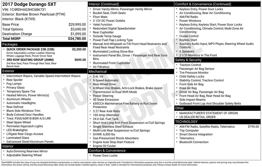 2017 Dodge Durango SXT Bomber Brown Pearlcoat SXT RWD 8-Speed Automatic 3.6L V6 24V VVT 1-Year SiriusXM Radio Service, 2nd Row 60/40 Fold & Tumble Seat, 3.27 Rear Axle Ratio, 3rd Row Seat, 3rd Row Seating Group, 4-Wheel Disc Brakes, 6 Speakers, 7-Passenger Seating, 8.4 Touchscreen Display, ABS brakes, Air Conditioning, Alloy wheels, AM/FM radio, Anti-whiplash front head restraints, Auto-Dimming Rear-View Mirror, Auto-dimming Rear-View mirror, Auto-leveling suspension, Automatic temperature control, Brake assist, Bright Side Roof Rails, Bumpers: body-color, Cloth Low-Back Bucket Seats, Comfort Seating Group, Compass, Delay-off headlights, Driver door bin, Driver vanity mirror, Dual front impact airbags, Dual front side impact airbags, Electronic Stability Control, Emergency communication system: Roadside Assistance/9-1-1 Call, For Details Visit DriveUconnect.com, For More Info, Call 800-643-2112, Four wheel independent suspension, Front anti-roll bar, Front Bucket Seats, Front Center Armrest w/Storage, Front dual zone A/C, Front fog lights, Front reading lights, Fully automatic headlights, GPS Antenna Input, Heated door mirrors, Illuminated entry, Integrated Roof Rail Crossbars, Integrated Voice Command w/Bluetooth, Interior Removable/Rechargeable Lamp, Knee airbag, Leather Wrapped Steering Wheel, Low tire pressure warning, Manufacturer's Statement of Origin, Nav-Capable! See Dealer for Details, Occupant sensing airbag, Outside temperature display, Overhead airbag, Overhead console, Panic alarm, Passenger door bin, Passenger vanity mirror, Power 4-Way Driver Lumbar Adjust, Power 8-Way Driver/Manual Passenger Seat, Power door mirrors, Power steering, Power windows, Quick Order Package 23B, Radio: Uconnect 3 w/5 Display, Radio: Uconnect 3C w/8.4 Display, Rear air conditioning, Rear anti-roll bar, Rear reading lights, Rear seat center armrest, Rear window defroster, Rear window wiper, Remote keyless entry, Roadside Assistance & 9-1-1 Call, SiriusXM Satellite Radio, Speed control, Speed-Sensitive Wipers, Split folding rear seat, Spoiler, Steering wheel mounted audio controls, Tachometer, Telescoping steering wheel, Tilt steering wheel, Traction control, Trip computer, Uconnect Access, US Dealer Retail Order, Variably intermittent wipers, Wheels: 18 x 8.0 Painted Aluminum.