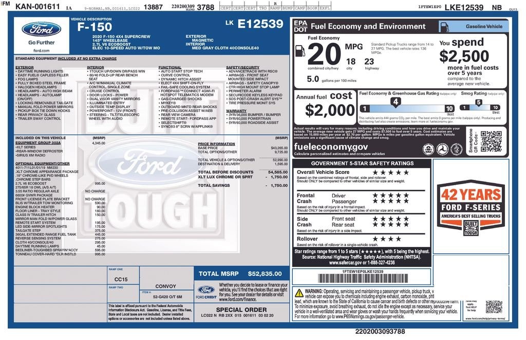 2020 Ford F-150 XLT Magnetic XLT 4WD 10-Speed Automatic 2.7L V6 EcoBoost 4WD, 18 Machined-Aluminum Wheels, 2-Bar Style Grille w/Chrome 2 Minor Bars, 4-Wheel Disc Brakes, 4.2 Productivity Screen in Instrument Cluster, 6 Speakers, 8-Way Power Driver Seat, ABS brakes, Air Conditioning, Alloy wheels, AM/FM radio, Auto High-beam Headlights, Auto-Dimming Rear-View Mirror, BLIS Blind Spot Information System, Brake assist, Bumpers: chrome, Chrome Door & Tailgate Handles w/Body-Color Bezel, Chrome Step Bars, Class IV Trailer Hitch Receiver, Cloth 40/20/40 Front Seat, Compass, Delay-off headlights, Driver door bin, Driver vanity mirror, Dual front impact airbags, Dual front side impact airbags, Electronic Stability Control, Emergency communication system: SYNC 3 911 Assist, Engine Block Heater, Equipment Group 302A Luxury, Extended Range 36 Gallon Fuel Tank, Exterior Parking Camera Rear, Fixed Backlight w/Privacy Glass, Front anti-roll bar, Front Center Armrest w/Storage, Front fog lights, Front License Plate Bracket, Front wheel independent suspension, Fully automatic headlights, GVWR: 6,500 lbs Payload Package, GVWR: 6,600 lbs Payload Package, Hard Folding Tonneau Box Cover (Dealer Installed), Heated Front Seats, Illuminated entry, Leather-Wrapped Steering Wheel, LED Sideview Mirror Spotlights, Low tire pressure warning, Occupant sensing airbag, Outside temperature display, Overhead airbag, Panic alarm, Passenger door bin, Passenger vanity mirror, Power door mirrors, Power Glass Heated Sideview Mirrors, Power steering, Power windows, Power-Adjustable Pedals, Radio data system, Radio: AM/FM Stereo w/6 Speakers, Rear step bumper, Rear Under-Seat Storage, Rear Window Defroster, Remote keyless entry, Remote Start System, Reverse Sensing System, Security system, Single-Tip Chrome Exhaust, SiriusXM Radio, Speed control, Speed-sensing steering, Split folding rear seat, Steering wheel mounted audio controls, SYNC 3, Tachometer, Tailgate Step w/Tailgate Lift Assist, Telescoping steering wheel, Tilt steering wheel, Tough Bed Spray-In Bedliner, Traction control, Tray Style Floor Liner, Variably intermittent wipers, Voltmeter, Wheels: 17 Silver Painted Aluminum, Wheels: 18 Chrome-Like PVD, XLT Chrome Appearance Package, 4WD.Recent Arrival!