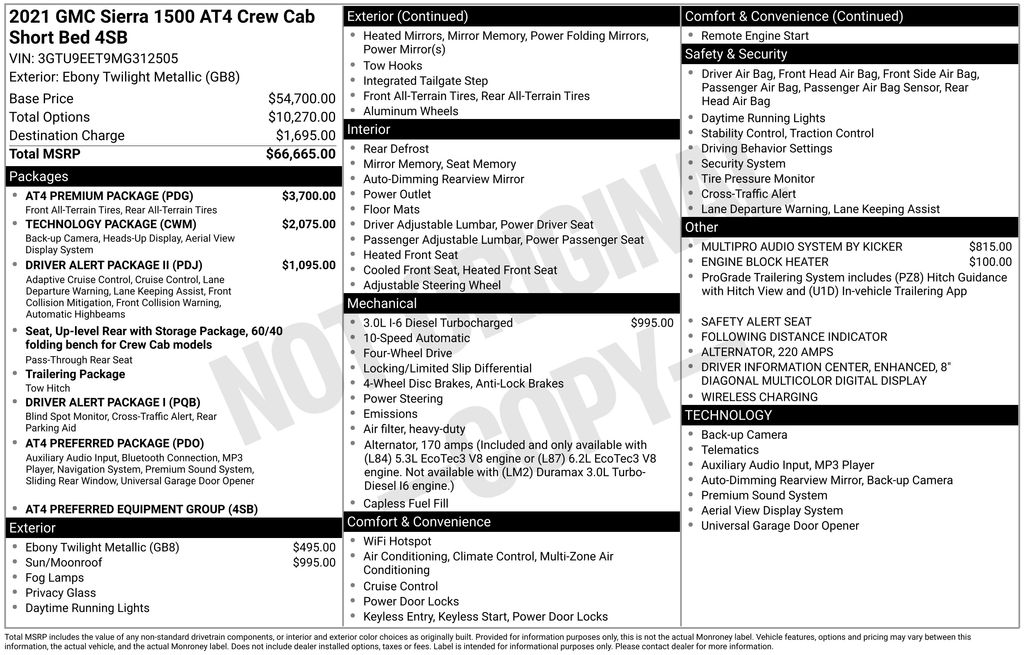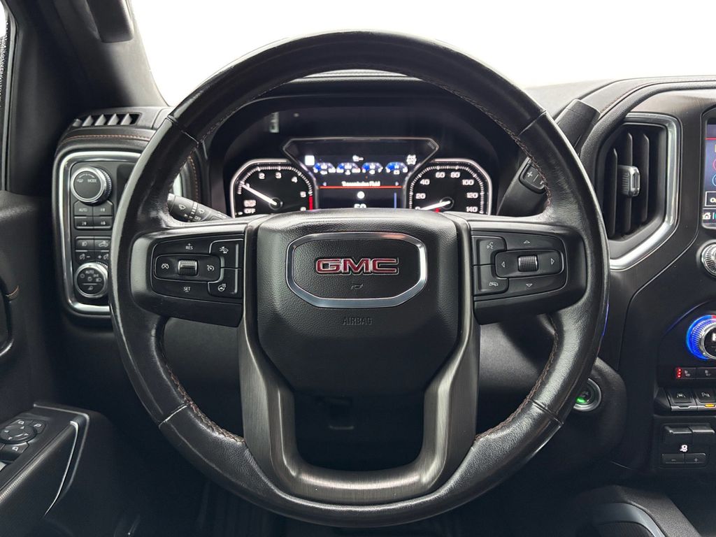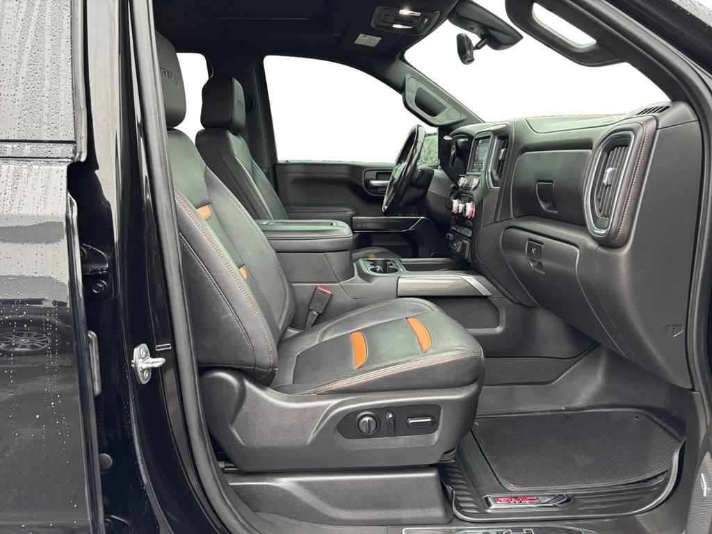 2021 GMC Sierra 1500 AT4 Ebony Twilight Metallic AT4 4WD 10-Speed Automatic 3.0L I6 10-Speed Automatic, 4WD, Jet Black With Kalahari Accents Leather, 10-Way Power Driver Seat Adjuster w/Lumbar, 10-Way Power Passenger Seat Adjuster w/Lumbar, 12-Volt Rear Auxiliary Power Outlet, 120-Volt Bed Mounted Power Outlet, 120-Volt Instrument Panel Power Outlet, 170 Amp Alternator, 18 x 8.5 Machined Aluminum Wheels, 2 USB Ports, 2 USB Ports (1st Row), 220 Amp Alternator, 3.23 Rear Axle Ratio, 4-Wheel Disc Brakes, 4.2 Diagonal Color Display Driver Info Center, 4G LTE Wi-Fi Hotspot Capable, 6 Speakers, 6-Speaker Audio System Feature, 8 Driver Information Center, ABS brakes, Adaptive Cruise Control, Air Conditioning, Alloy wheels, AM/FM radio: SiriusXM with 360L, Apple CarPlay/Android Auto, AT4 High Clearance Step (LPO), AT4 Preferred Package, AT4 Premium Package, Auto-dimming door mirrors, Auto-dimming Rear-View mirror, Auto-Locking Rear Differential, Automatic Emergency Braking, Automatic temperature control, Auxiliary External Transmission Oil Cooler, Bed View Camera, Body-Color Surround Grille, Brake assist, Bumpers: body-color, Color-Keyed Carpeting Floor Covering, Compass, Deep-Tinted Glass, Delay-off headlights, Driver Alert Package I, Driver Alert Package II, Driver door bin, Driver Memory, Driver vanity mirror, Dual front impact airbags, Dual front side impact airbags, Electric Rear-Window Defogger, Electrical Lock Control Steering Column, Electronic Stability Control, Engine Block Heater, Floor-Mounted Center Console, Following Distance Indicator, Forward Collision Alert, Front anti-roll bar, Front Bucket Seats, Front Center Armrest, Front dual zone A/C, Front fog lights, Front Pedestrian Braking, Front Prem Floor Liners w/Removable Carpet Insert, Front reading lights, Front wheel independent suspension, Fully automatic headlights, GMC Connected Access Capable, HD Rear Vision Camera, HD Surround Vision w/2 Trailer View Camera Provisions, Heated 2nd Row Outboard Seats, Heated door mirrors, Heated Driver & Front Outboard Passenger Seating, Heated front seats, Heated steering wheel, Heavy-Duty Air Filter, Hill Descent Control, Hitch Guidance, Hitch Guidance w/Hitch View, Illuminated entry, In-Vehicle Trailering App, Integrated Trailer Brake Controller, IntelliBeam Automatic High Beam On/Off, Keyless Open & Start, Lane Change Alert w/Side Blind Zone Alert, Lane Keep Assist w/Lane Departure Warning, LED Cargo Area Lighting, Low tire pressure warning, Manual Tilt-Wheel & Telescoping Steering Column, Memory seat, Multicolor 15 Diagonal Head-Up Display, MultiPro Audio System by Kicker, Occupant sensing airbag, Off-Road Suspension, OnStar & GMC Connected Services Capable, Outside temperature display, Overhead airbag, Overhead console, Panic alarm, Passenger door bin, Passenger vanity mirror, Perforated Leather-Appointed Front Seat Trim, Perimeter Lighting, Power Door Locks, Power door mirrors, Power driver seat, Power Front Passenger Windows w/Express Up/Down, Power Front Windows w/Driver Express Up/Down, Power passenger seat, Power Rear Windows w/Express Down, Power Sliding Rear Window w/Rear Defogger, Power steering, Power Sunroof, Power windows, Preferred Equipment Group 4SB, Premium audio system: GMC Infotainment System, Premium Bose 7-Speaker Sound System, ProGrade Trailering System, Radio data system, Radio: Premium GMC Infotainment Sys w/Multi-Touch, Radio: Premium GMC Infotainment Sys w/Navigation, Rear Camera Mirror, Rear Cross Traffic Alert, Rear Dual USB Charging-Only Ports, Rear Prem Floor Liners w/Removable Carpet Insert, Rear reading lights, Rear seat center armrest, Rear step bumper, Rear Wheelhouse Liners, Rear window defroster, Red Recovery Hooks, Remote keyless entry, Remote Vehicle Starter System, Safety Alert Seat, Security system, SiriusXM w/360L, Speed control, Speed-sensing steering, Split folding rear seat, Spray-On Pickup Bed
