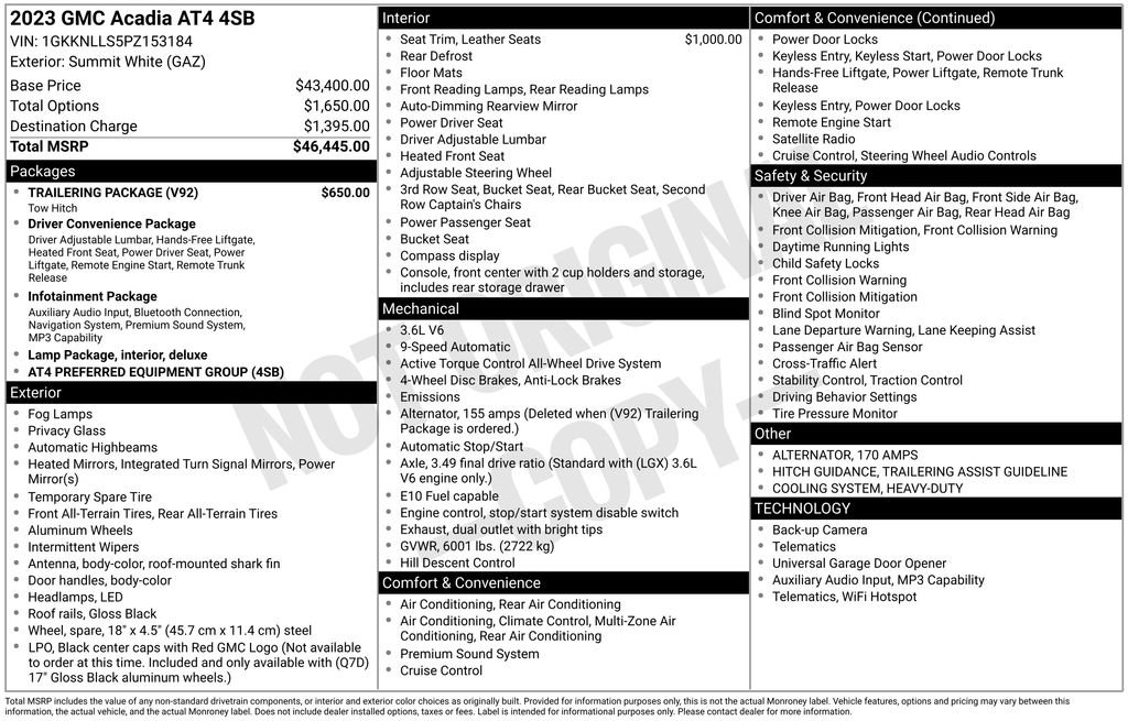 2023 GMC Acadia AT4 Summit White AT4 AWD 9-Speed Automatic 3.6L V6 SIDI AWD, Jet Black Leather, 170 Amp Alternator, 3.49 Final Drive Axle Ratio, 3rd row seats: split-bench, 4-Way Manual Passenger Seat Adjuster, 4-Wheel Disc Brakes, 6-Passenger (2-2-2 Seating Configuration), 8 Speakers, 8-Way Power Driver Seat Adjuster, 8-Way Power Passenger Seat Adjuster, ABS brakes, Air Conditioning, Alloy wheels, AM/FM radio: SiriusXM with 360L, Apple CarPlay/Android Auto, Auto High-beam Headlights, Auto-dimming Rear-View mirror, Automatic temperature control, Bose Premium 8-Speaker Audio System Feature, Brake assist, Bumpers: body-color, Compass, Delay-off headlights, Driver door bin, Driver vanity mirror, Dual front impact airbags, Dual front side impact airbags, Electronic Stability Control, Emergency communication system: OnStar and GMC connected services capable, Four wheel independent suspension, Front anti-roll bar, Front Bucket Seats, Front Center Armrest, Front dual zone A/C, Front fog lights, Front reading lights, Fully automatic headlights, Garage door transmitter, Heated door mirrors, Heated Driver & Front Passenger Seats, Heated front seats, Heavy-Duty Cooling System, Hitch Guidance w/Hitch View, Illuminated entry, Knee airbag, Low tire pressure warning, Navigation System, Occupant sensing airbag, Outside temperature display, Overhead airbag, Overhead console, Panic alarm, Passenger door bin, Passenger vanity mirror, Power door mirrors, Power Driver Lumbar Control Seat Adjuster, Power driver seat, Power Liftgate, Power steering, Power windows, Preferred Equipment Group 4SB, Premium Cloth Seat Trim, Radio data system, Radio: AM/FM 8 Diagonal Multi-Touch Navigation, Rear air conditioning, Rear anti-roll bar, Rear reading lights, Rear window defroster, Rear window wiper, Remote keyless entry, Roof rack: rails only, Security system, SiriusXM w/360L, Speed control, Speed-sensing steering, Spoiler, Steering wheel mounted audio controls, Tachometer, Telescoping steering wheel, Tilt steering wheel, Traction control, Trailering Assist Guidelines, Trailering Package, Trip computer, Turn signal indicator mirrors, Variably intermittent wipers, Voltmeter, Wheels: 17 Gloss Black Aluminum, Wireless Apple CarPlay/Wireless Android Auto, AWD, Jet Black Leather.