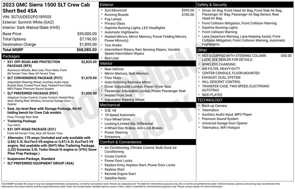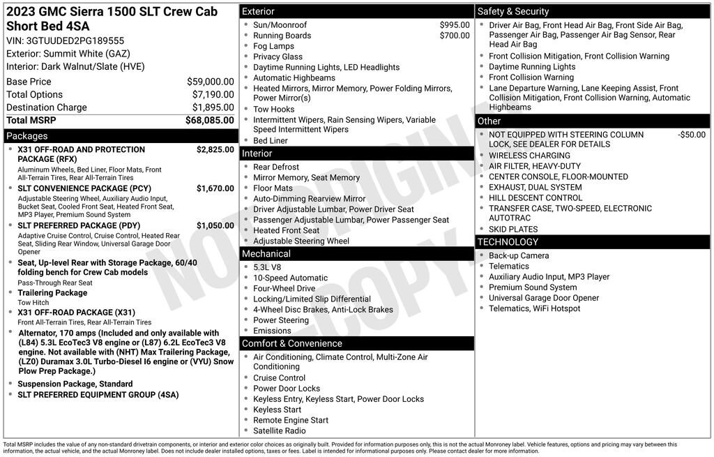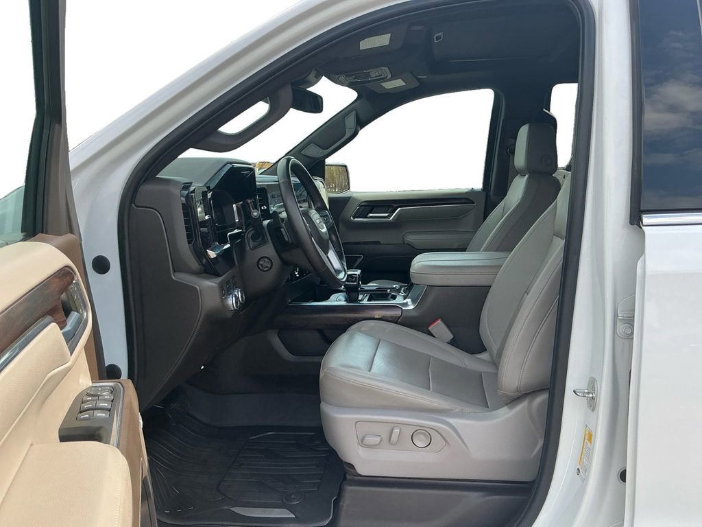 2023 GMC Sierra 1500 SLT Summit White SLT 4WD 10-Speed Automatic EcoTec3 5.3L V8 10-Speed Automatic, 4WD, Dark Walnut/Slate Leather, 10-Way Power Driver Seat Adjuster w/Lumbar, 10-Way Power Passenger Seat Adjuster w/Lumbar, 120-Volt Bed Mounted Power Outlet, 120-Volt Instrument Panel Power Outlet, 170 Amp Alternator, 2 Charge/Data USB Ports, 2 Charge/Data USB Ports Inside Center Console, 2 Type-C Charge-Only Rear USB Ports, 20 Polished Aluminum Wheels, 3.23 Rear Axle Ratio, 4-Wheel Disc Brakes, 6 Speakers, 6-Speaker Audio System Feature, ABS brakes, Adaptive Cruise Control, Air Conditioning, All-Weather Floor Liner (LPO), Alloy wheels, AM/FM radio, Apple CarPlay/Android Auto, Auto High-beam Headlights, Auto-dimming door mirrors, Auto-dimming Rear-View mirror, Auto-Locking Rear Differential, Automatic Emergency Braking, Automatic temperature control, Auxiliary External Transmission Oil Cooler, Brake assist, Buckle to Drive, Bumpers: chrome, Chrome Header & Chrome Grille Insert Bars, Chrome Wheel To Wheel Assist Steps, Color-Keyed Carpeting Floor Covering, Compass, Deep-Tinted Glass, Delay-off headlights, Driver door bin, Driver Memory, Driver vanity mirror, Dual Exhaust System, Dual front impact airbags, Dual front side impact airbags, Electric Rear-Window Defogger, Electrical Steering Column Lock, Electronic Precision Shift, Electronic Stability Control, Emergency communication system: OnStar and GMC connected services capable, Floor-Mounted Center Console, Following Distance Indicator, Forward Collision Alert, Front 40/20/40 Split-Bench Seat, Front anti-roll bar, Front Bucket Seats, Front Center Armrest w/Storage, Front dual zone A/C, Front fog lights, Front Frame-Mounted Black Recovery Hooks, Front Pedestrian Braking, Front Rainsensing Wipers, Front reading lights, Front wheel independent suspension, Fully automatic headlights, GMC Connected Access Capable, HD Rear Vision Camera, Heated 2nd Row Outboard Seats, Heated door mirrors, Heated Driver & Front Outboard Passenger Seating, Heated front seats, Heated steering wheel, Heavy-Duty Air Filter, High Capacity Suspension Package, Hill Descent Control, Hitch Guidance, Illuminated entry, IntelliBeam Automatic High Beam On/Off, Keyless Open & Start, Lane Keep Assist w/Lane Departure Warning, LED Cargo Area Lighting, Low tire pressure warning, Manual Tilt-Wheel & Telescoping Steering Column, Memory seat, Navigation System, Not Equipped w/Steering Column Lock, Occupant sensing airbag, Off-Road Suspension, OnStar & GMC Connected Services Capable, Outside temperature display, Overhead airbag, Overhead console, Panic alarm, Passenger door bin, Passenger vanity mirror, Perf Leather-Appointed Front Outboard Seat Trim, Perimeter Lighting, Power Door Locks, Power door mirrors, Power driver seat, Power Front Passenger Windows w/Express Up/Down, Power Front Windows w/Driver Express Up/Down, Power passenger seat, Power Rake & Telescoping Steering Column, Power Rear Windows w/Express Down, Power Sliding Rear Window w/Rear Defogger, Power steering, Power Sunroof, Power windows, Preferred Equipment Group 4SA, Premium audio system: GMC Infotainment System, Premium Bose 7-Speaker Sound System, Push Button Start, Radio data system, Radio: Premium GMC Infotainment Audio System, Rain sensing wipers, Rear reading lights, Rear seat center armrest, Rear step bumper, Rear Wheelhouse Liners, Rear window defroster, Remote keyless entry, Remote Vehicle Starter System, Security system, SiriusXM w/360L, SLT Convenience Package, SLT Preferred Package, Speed control, Speed-sensing steering, Split folding rear seat, Spray-On Pickup Bed Liner w/GMC Logo, Standard Suspension Package, Steering Wheel Audio Controls, Steering wheel mounted audio controls, Tachometer, Telescoping steering wheel, Theft Deterrent System (Unauthorized Entry), Tilt steering wheel, Traction control, Trailering Package, Trip computer, Universal Home Remote, Variably intermittent wipers, Ven