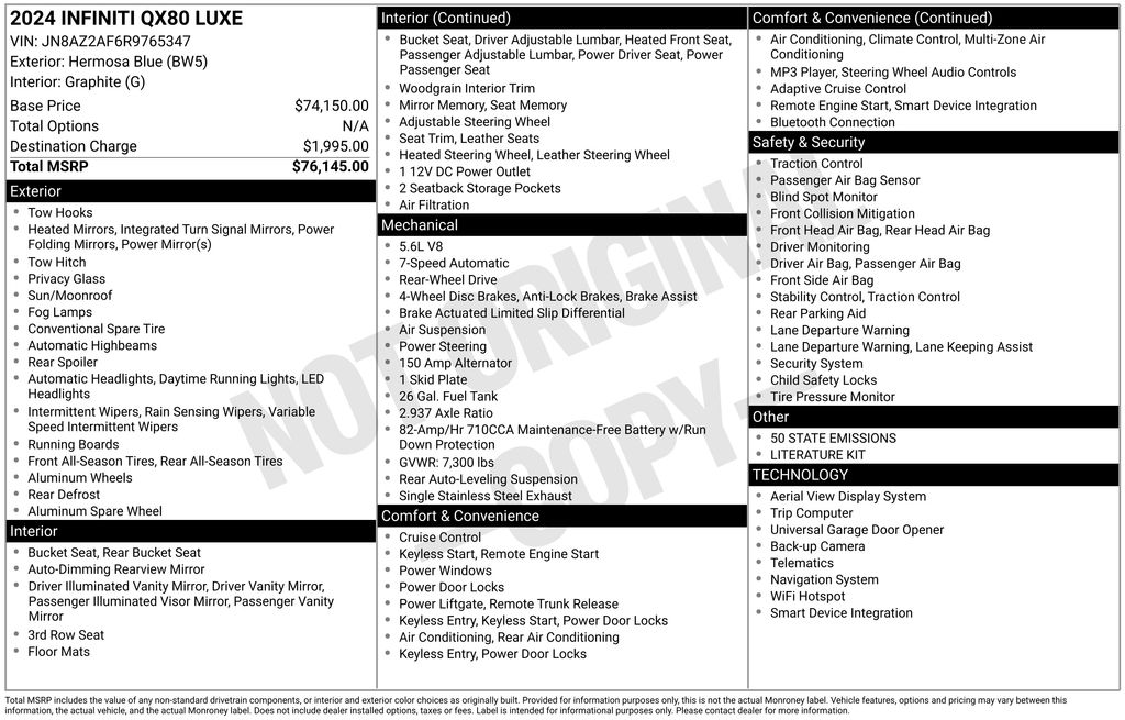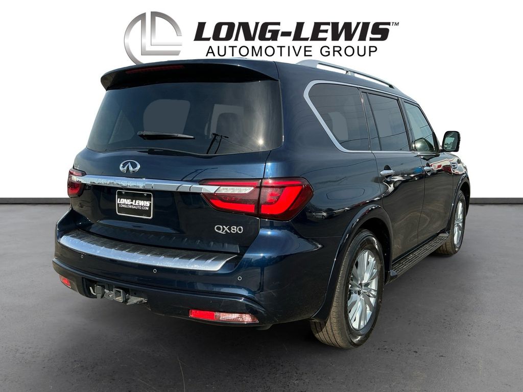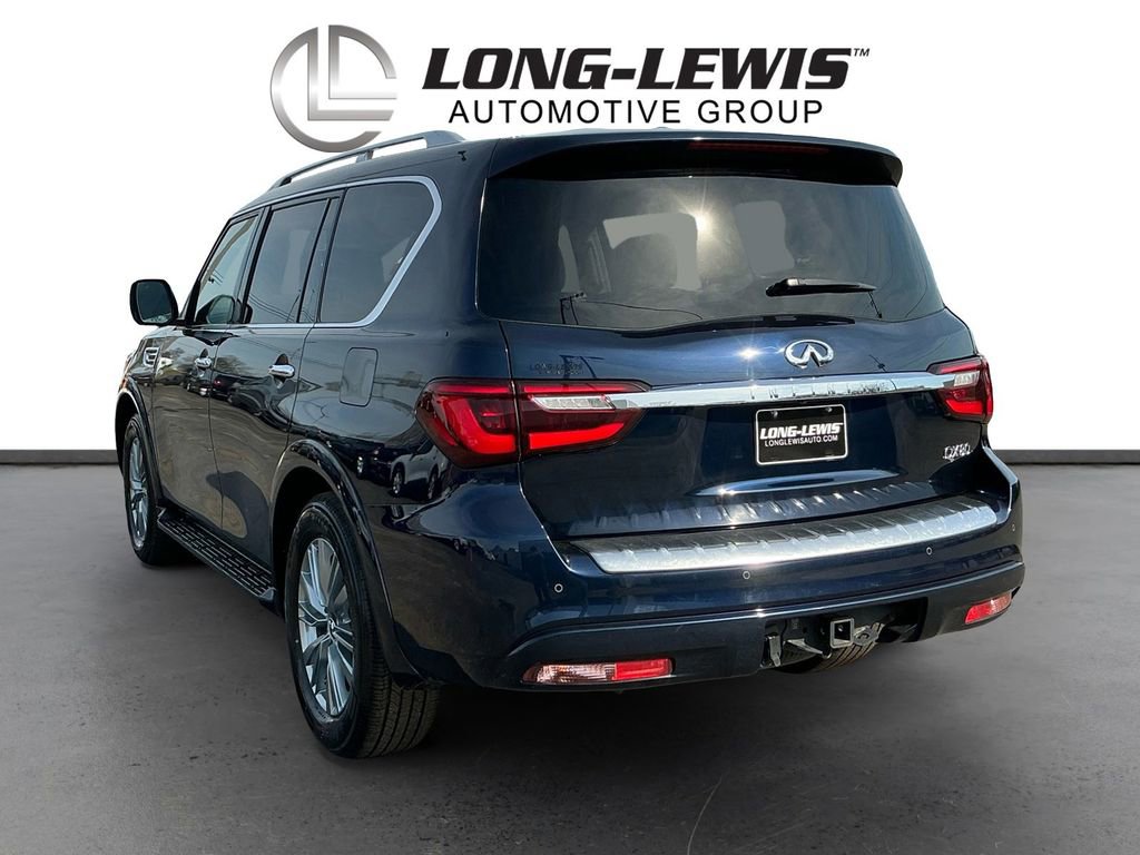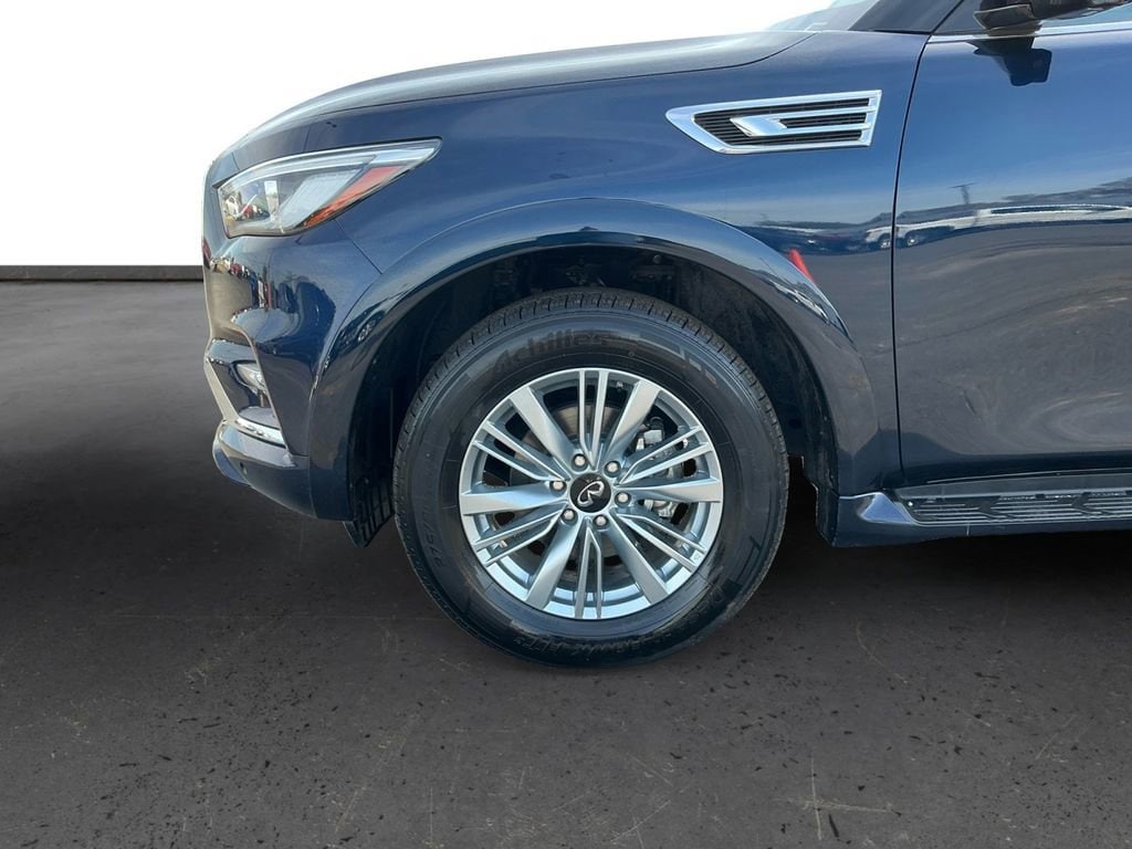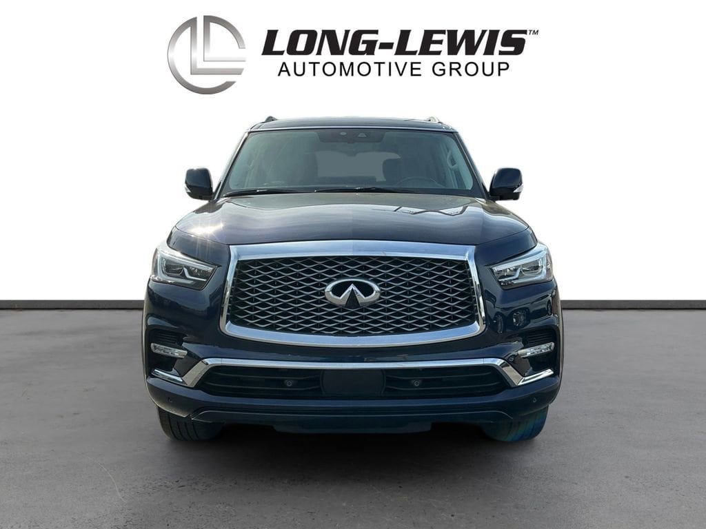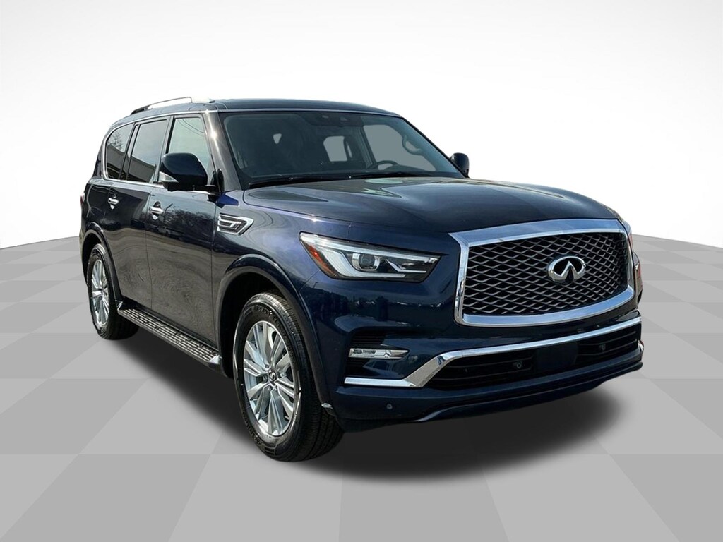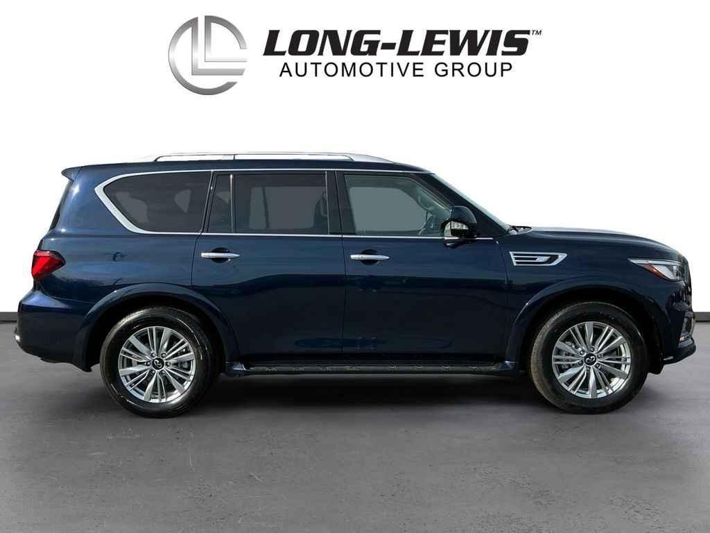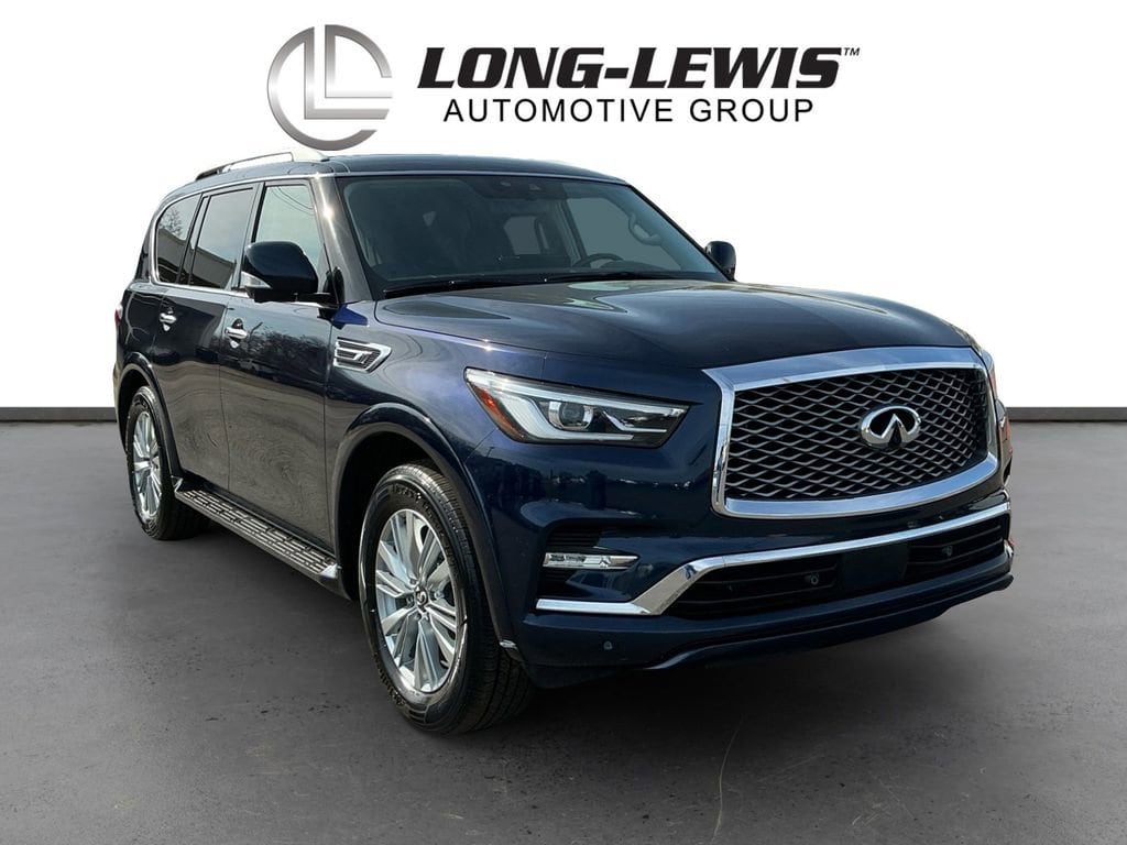 2024 INFINITI QX80 LUXE Hermosa Blue LUXE RWD 7-Speed Automatic 5.6L V8 13 Speakers, 2.937 Axle Ratio, 20 Aluminum Alloy Wheels, 3rd row seats: bench, 4-Wheel Disc Brakes, ABS brakes, Air Conditioning, Alloy wheels, AM/FM radio: SiriusXM, Anti-whiplash front head restraints, Apple CarPlay/Android Auto, Auto High-beam Headlights, Auto tilt-away steering wheel, Auto-dimming door mirrors, Auto-dimming Rear-View mirror, Auto-leveling suspension, Automatic temperature control, Brake assist, Bumpers: body-color, Compass, Delay-off headlights, Driver door bin, Driver vanity mirror, Dual front impact airbags, Dual front side impact airbags, Electronic Stability Control, Emergency communication system: INFINITI InTouch, Four wheel independent suspension, Front anti-roll bar, Front Bucket Seats, Front Center Armrest, Front dual zone A/C, Front fog lights, Front reading lights, Fully automatic headlights, Garage door transmitter: HomeLink, Heated door mirrors, Heated Front Bucket Seats, Heated front seats, Heated steering wheel, Illuminated entry, Leather Shift Knob, Leather steering wheel, Leather-Appointed Seats, Literature Kit, Low tire pressure warning, Memory seat, Navigation system: INFINITI InTouch Navigation, Occupant sensing airbag, Outside temperature display, Overhead airbag, Overhead console, Panic alarm, Passenger door bin, Passenger vanity mirror, Power door mirrors, Power driver seat, Power Liftgate, Power moonroof, Power passenger seat, Power steering, Power windows, Radio data system, Radio: Bose Premium Audio System w/13 Speakers, Rain sensing wipers, Rear air conditioning, Rear anti-roll bar, Rear reading lights, Rear seat center armrest, Rear window defroster, Rear window wiper, Reclining 3rd row seat, Remote keyless entry, Security system, Speed control, Speed-sensing steering, Split folding rear seat, Spoiler, Steering wheel memory, Steering wheel mounted audio controls, Tachometer, Telescoping steering wheel, Tilt steering wheel, Traction control, Trip computer, Turn signal indicator mirrors, Variably intermittent wipers, Voltmeter.