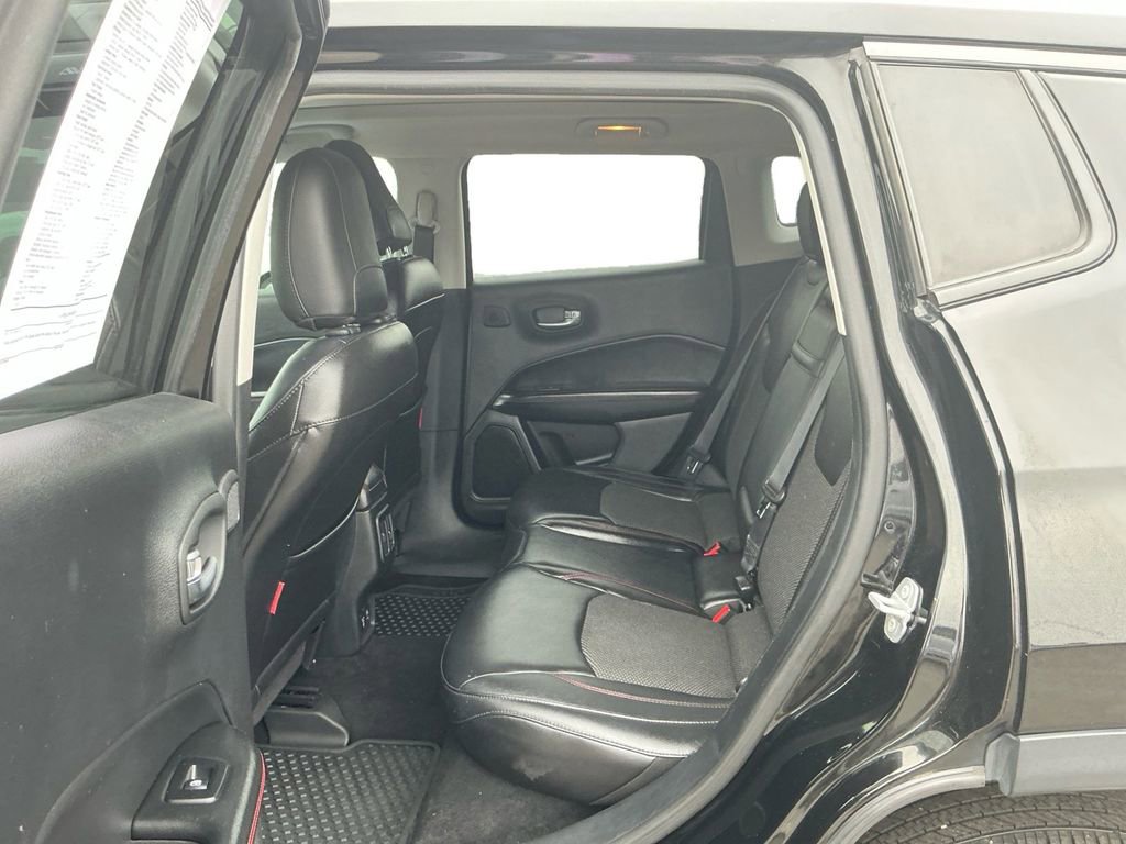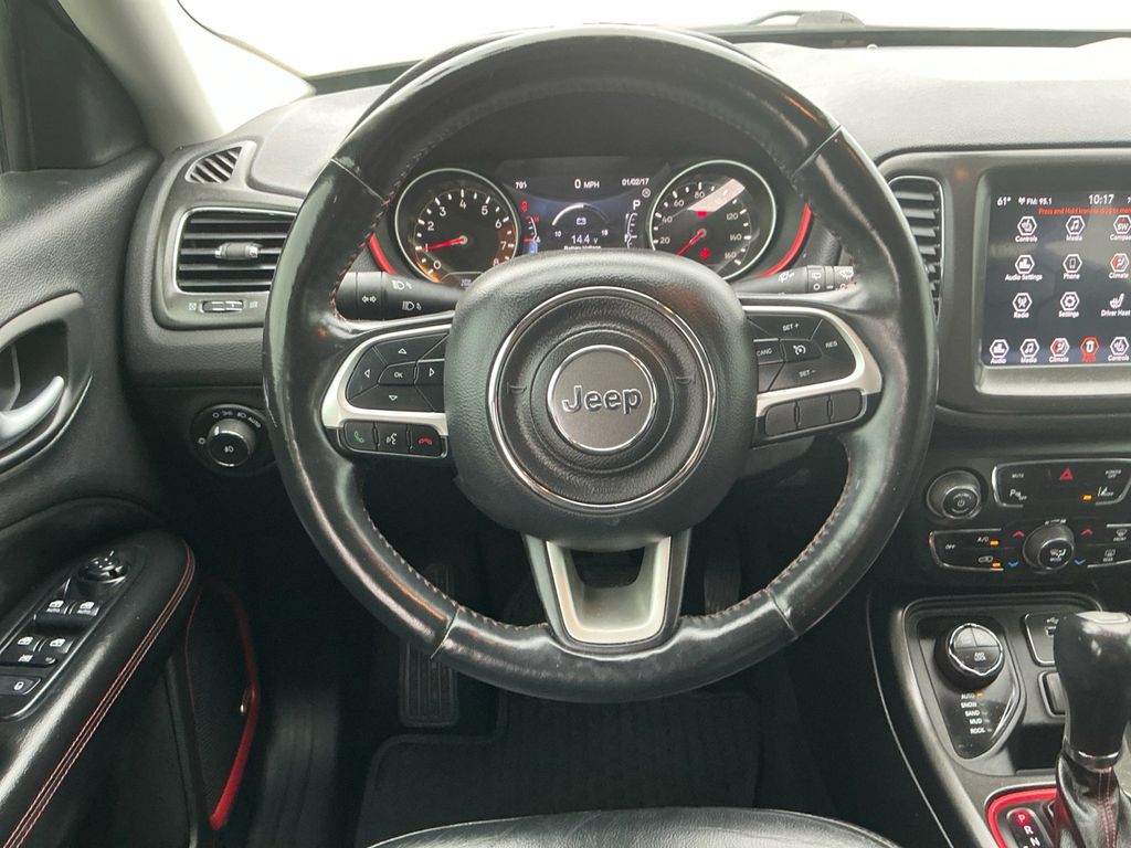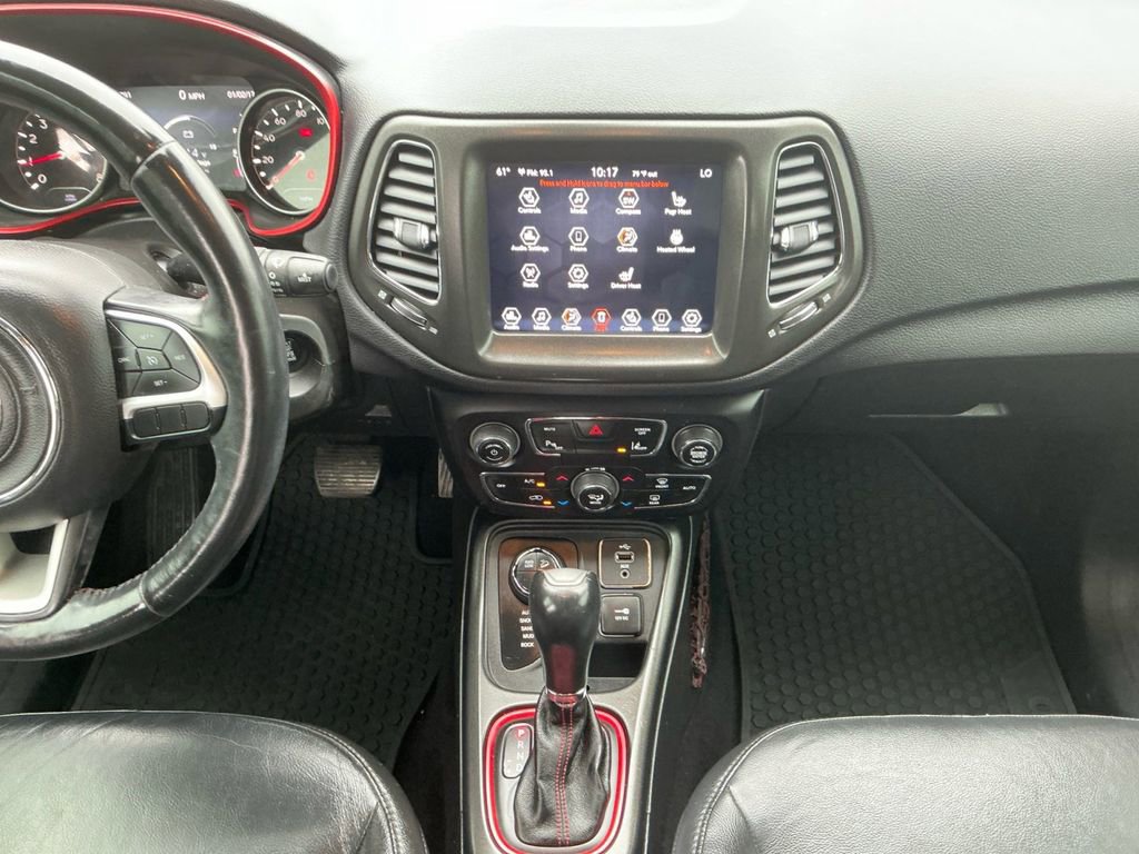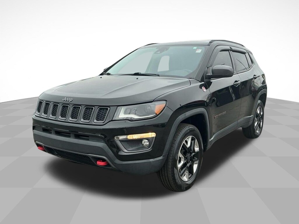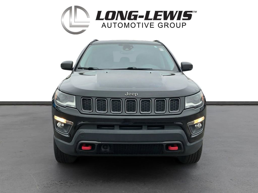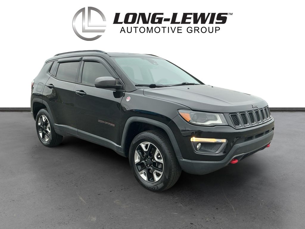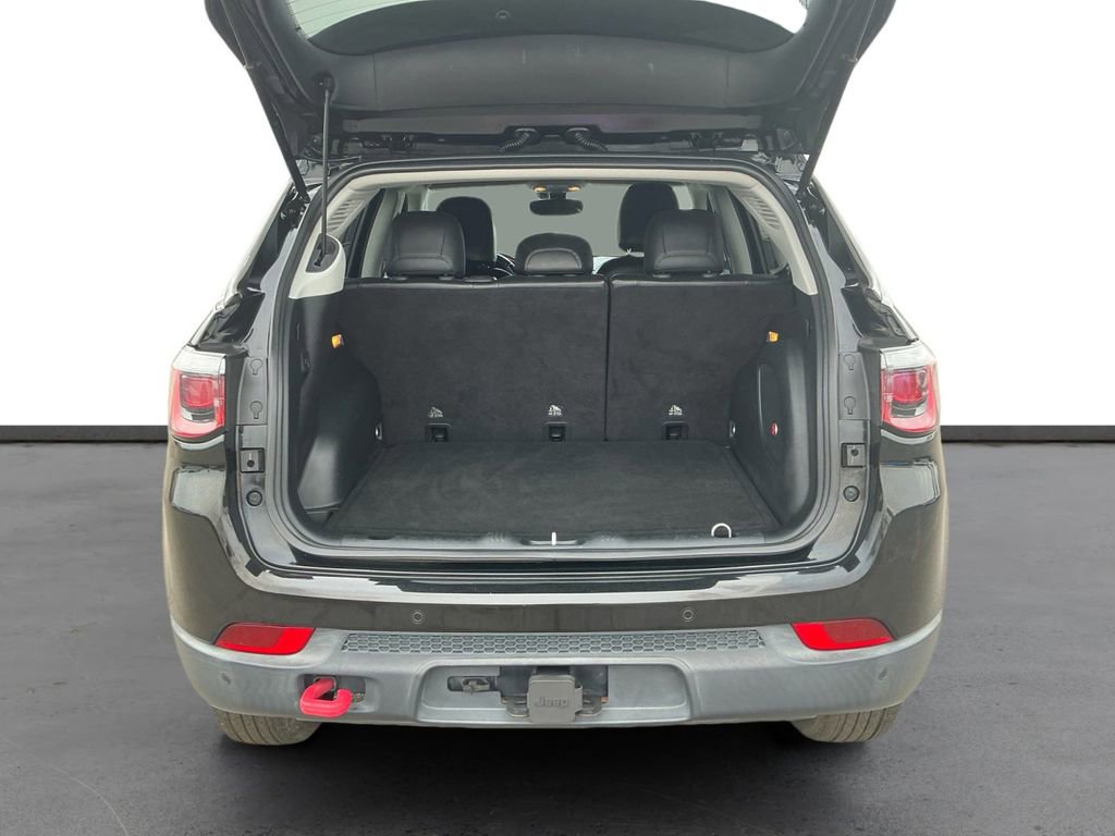 2018 Jeep Compass Trailhawk Diamond Black Crystal Pearlcoat Trailhawk 4WD 9-Speed Automatic 2.4L I4 4WD, 4-Way Power Lumbar Adjust, 4-Wheel Disc Brakes, 4.334 Axle Ratio, 6 Speakers, 7 & 4 Pin Wiring Harness, ABS brakes, Advanced Safety & Lighting Group, Air Conditioning, Alloy wheels, AM/FM radio: SiriusXM, Anti-whiplash front head restraints, Apple CarPlay/Android Auto, Auto High Beam Headlamp Control, Auto-Dimming Rear-View Mirror, Automatic temperature control, Beats Premium Audio System, Bi-Xenon High-Intensity Discharge Headlamps, Blind Spot & Cross Path Detection, Brake assist, Bumpers: body-color, Class III Receiver Hitch, Cold Weather Group, Compass, Delay-off headlights, Driver door bin, Driver vanity mirror, Dual front impact airbags, Dual front side impact airbags, Electronic Stability Control, Four wheel independent suspension, Front anti-roll bar, Front Bucket Seats, Front Center Armrest w/Storage, Front dual zone A/C, Front fog lights, Front reading lights, Full Speed FWD Collision Warn Plus, Fully automatic headlights, Heated door mirrors, Heated Front Seats, Heated Steering Wheel, Illuminated entry, Knee airbag, Lane Departure Warning Plus, Leather Shift Knob, Low tire pressure warning, Occupant sensing airbag, Outside temperature display, Overhead airbag, Overhead console, Panic alarm, ParkSense Rear Park Assist System, ParkView Rear Back-Up Camera, Passenger door bin, Passenger vanity mirror, Popular Equipment Group, Power 8-Way Driver/Manual 6-Way Passenger Seats, Power door mirrors, Power Front/Fixed Rear Full Sunroof, Power Liftgate, Power steering, Power windows, Premium Cloth/Leather Trim Bucket Seats, Quick Order Package 27E, Radio: Uconnect 4 w/8.4 Display, Rain Sensitive/Intermittent Wipers, Rear anti-roll bar, Rear seat center armrest, Rear window defroster, Rear window wiper, Remote keyless entry, Remote Start System, Roof rack: rails only, Safe & Security Group, Security Alarm, Speed control, Split folding rear seat, Spoiler, Steering wheel mounted audio controls, Tachometer, Telescoping steering wheel, Tilt steering wheel, Traction control, Trailer Tow Group, Trip computer, Turn signal indicator mirrors, Variably intermittent wipers, Wheels: 17 x 6.5 Polished/Black Pockets Aluminum, Windshield Wiper De-Icer, 4WD.