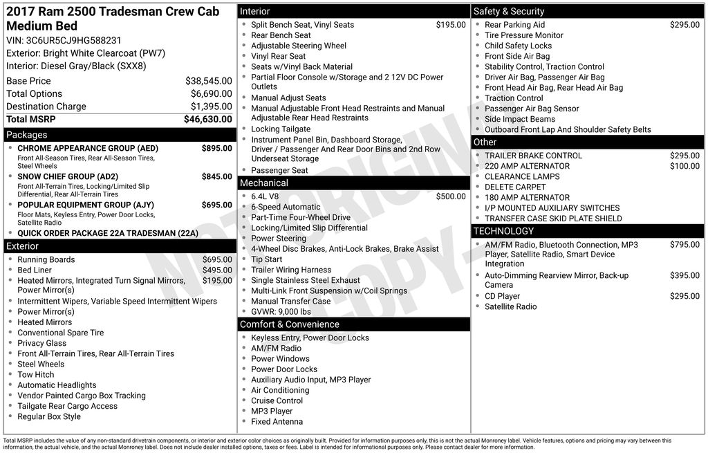 2017 Ram 2500 Tradesman Bright White Clearcoat Tradesman 4WD 6-Speed Automatic 6.4L Heavy Duty V8 HEMI w/MDS 1-Yr SiriusXM Radio Service, 17 x 7.5 Steel Styled Wheels, 220 Amp Alternator, 3.73 Axle Ratio, 4-Wheel Disc Brakes, 40/20/40 Split Bench Seat, 5.0 Touchscreen Display, 6 Speakers, ABS brakes, Air Conditioning, AM/FM radio, Anti-Spin Differential Rear Axle, Black Exterior Mirrors, Black Wheel Flares, Brake assist, Bright Front Bumper, Bright Grille, Bright Rear Bumper, Carpet Floor Covering, Center Hub, Charge Only Remote USB Port, Chrome Appearance Group, Clearance Lamps, Cloth 40/20/40 Bench Seat, Delay-off headlights, Driver door bin, Dual front impact airbags, Dual front side impact airbags, Electronic Stability Control, Electronically Controlled Throttle, Exterior Mirrors Courtesy Lamps, Exterior Mirrors w/Heating Element, Exterior Mirrors w/Supplemental Signals, For More Info, Call 800-643-2112, Front & Rear Floor Mats, Front anti-roll bar, Front Armrest w/Cupholders, Front Center Armrest, Front Performance Tuned Shock Absorbers, Fully automatic headlights, GPS Antenna Input, Heated door mirrors, Heavy Duty Vinyl 40/20/40 Split Bench Seat, Hemi Badge, I/P Mounted Auxiliary Switches, Integrated Voice Command w/Bluetooth, Locking Tailgate, Low tire pressure warning, Manual Adjust Seats, Media Hub (USB, AUX), Next Generation Engine Controller, No Satellite Coverage w/AK/HI, Occupant sensing airbag, Off Road Package, Offroad Decal, Overhead airbag, Overhead Console, ParkSense Rear Park Assist System, ParkView Rear Back-Up Camera, Passenger door bin, Popular Equipment Group, Power Black Trailer Tow Mirrors, Power door mirrors, Power steering, Power windows, Protection Group, Quick Order Package 22A Tradesman, Radio data system, Radio: 3.0, Radio: Uconnect 3 w/5 Display, Rear Folding Seat, Rear Performance Tuned Shock Absorbers, Rear step bumper, Rear View Auto Dim Mirror w/Display, Remote Keyless Entry, Single Disc Remote CD Player, SiriusXM Satellite Radio, Snow Chief Group, Speed control, Spray In Bedliner, Tachometer, Temperature & Compass Gauge, Tilt steering wheel, Tip Start, Tow Hooks, Traction control, Trailer Brake Control, Trailer Tow Mirrors, Variably intermittent wipers, Vendor Painted Cargo Box Tracking, Voltmeter, Wheel to Wheel Side Steps, Wheels: 18 x 8.0 Steel Chrome Clad.