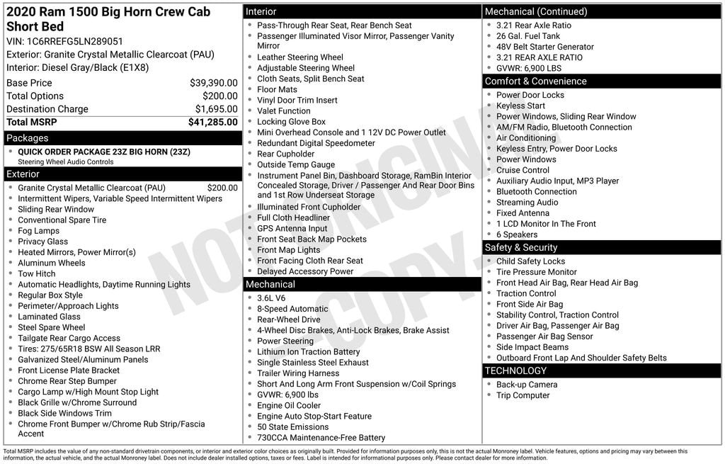 2020 Ram 1500 Big Horn/Lone Star Granite Crystal Metallic Clearcoat Big Horn/Lone Star RWD 8-Speed Automatic 3.6L V6 24V VVT 3 Rear Seat Head Restraints, 3.21 Rear Axle Ratio, 4 Way Front Headrests, 4-Wheel Disc Brakes, 48V Belt Starter Generator, 6 Speakers, ABS brakes, Air Conditioning, Alloy wheels, AM/FM radio, Brake assist, Bumpers: chrome, Cloth Bench Seat, Compass, Delay-off headlights, Driver door bin, Dual front impact airbags, Dual front side impact airbags, Electronic Stability Control, Front anti-roll bar, Front Center Armrest w/Storage, Front fog lights, Front reading lights, Front Seat Back Map Pockets, Front wheel independent suspension, Fully automatic headlights, GPS Antenna Input, Heated door mirrors, Illuminated entry, Leather steering wheel, Low tire pressure warning, Occupant sensing airbag, Outside temperature display, Overhead airbag, Overhead console, Panic alarm, ParkView Rear Back-Up Camera, Passenger door bin, Passenger vanity mirror, Power door mirrors, Power steering, Power windows, Quick Order Package 23Z Big Horn, Radio data system, Radio: Uconnect 3 w/5 Display, Rear 60/40 Folding Seat, Rear anti-roll bar, Rear seat center armrest, Rear step bumper, Remote keyless entry, Speed control, Split folding rear seat, Steering Wheel Mounted Audio Controls, Steering wheel mounted audio controls, Tachometer, Telescoping steering wheel, Tilt steering wheel, Traction control, Trip computer, Variably intermittent wipers, Voltmeter, Wheels: 18 x 8 Cast-Aluminum Painted.