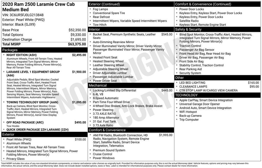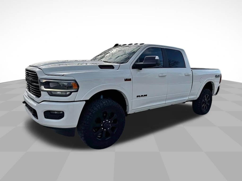 2020 Ram 2500 Laramie Pearl White Laramie 4WD 8-Speed Automatic 6.4L Heavy Duty V8 HEMI w/MDS 1-Year SiriusXM Guardian Trial, 10 Speakers, 115V Auxiliary Rear Power Outlet, 12 Touchscreen Display, 2 Way Rear Headrest Seat, 2nd Row In Floor Storage Bins, 3.73 Axle Ratio, 4 Way Front Headrests, 4-Wheel Disc Brakes, 400W Inverter, 5-Year SiriusXM Traffic Service, 5-Year SiriusXM Travel Link Service, 8.4 Touchscreen Display, ABS brakes, Active Noise Control System, Adjustable pedals, Air Conditioning, Alloy wheels, AM/FM radio: SiriusXM, Anti-Spin Differential Rear Axle, Apple CarPlay, Apple CarPlay/Android Auto, Auto High Beam Headlamp Control, Auto-dimming Rear-View mirror, Automatic temperature control, Black Exterior Mirrors, Black Exterior Truck Badging, Black Headlamp Bezels, Black Interior Accents, Black Ram Head Tailgate Badge, Black Tail Lamp Bezels, Black Wheel Center Hub, Blind Spot & Cross Path Detection, Body Color Door Handles, Body Color Grille Surround, Brake assist, Bumpers: chrome, Clearance Lamps, Compass, CTR Stop Lamp w/Cargo View Camera, Delay-off headlights, Disassociated Touchscreen Display, Driver door bin, Driver vanity mirror, Dual front impact airbags, Dual front side impact airbags, Electronic Stability Control, Electronically Controlled Throttle, Exterior Mirrors w/Memory, Foam Bottle Insert (Door Trim Panel), For Details Visit DriveUconnect.com, Front anti-roll bar, Front Center Armrest w/Storage, Front dual zone A/C, Front fog lights, Front Performance Tuned Shock Absorbers, Front reading lights, Front Seat Back Map Pockets, Fully automatic headlights, Garage door transmitter, Gloss Black Grille Billets/Accents, Google Android Auto, GPS Antenna Input, GPS Navigation, HD Radio, Heated door mirrors, Heated Front Seats, Heated front seats, Heated Steering Wheel, Heated steering wheel, Hill Descent Control, Illuminated entry, Integrated Center Stack Radio, Integrated Voice Command w/Bluetooth, Laramie Level 1 Equipment Group, Leather steering wheel, Leather Trim 40/20/40 Bench Seat, LED Bed Lighting, Low tire pressure warning, Mirror-Mounted Aux Reverse Lamps, Night Edition, Occupant sensing airbag, Off Road Decal, Off Road Package, Outside temperature display, Overhead airbag, Overhead console, Painted Front Bumper, Painted Rear Bumper, Panic alarm, ParkView Rear Back-Up Camera, Passenger door bin, Passenger vanity mirror, Power 2-Way Driver Lumbar Adjust, Power 2-Way Passenger Lumbar Adjust, Power Adjust 8-Way Driver Seat, Power Adjust 8-Way Front Passenger Seat, Power Adjustable Convex Aux Mirrors, Power Adjustable Pedals w/Memory, Power Black Tow Mirrors w/Convex Spotter & Memory, Power Chrome Tow Mirrors w/Convex Spotter & Memory, Power door mirrors, Power driver seat, Power passenger seat, Power steering, Power windows, Quick Order Package 2ZH Laramie, Radio data system, Radio: Uconnect 12.0 w/Navigation, Radio: Uconnect 4 w/8.4 Display, Radio/Driver Seat/Mirrors/Pedals Memory, Rain Sensitive Windshield Wipers, Rear 60/40 Folding Seat, Rear anti-roll bar, Rear Performance Tuned Shock Absorbers, Rear reading lights, Rear seat center armrest, Rear step bumper, Rear window defroster, Remote keyless entry, Remote Tailgate Release, Security system, SiriusXM Satellite Radio, SiriusXM Traffic Plus, SiriusXM Travel Link, SiriusXM w/360L, Speed control, Split folding rear seat, Steering wheel mounted audio controls, Surround View Camera System, Tachometer, Tilt steering wheel, Tip Start, Tow Hooks, Towing Technology Group, Traction control, Trailer Reverse Guidance, Trip computer, Turn signal indicator mirrors, USB Host Flip, Variably intermittent wipers, Vendor Painted Cargo Box Tracking, Ventilated Front Seats, Voltmeter, Wheels: 18 x 8.0 Polished Aluminum, Wheels: 20 x 8.0 Black Painted Aluminum.