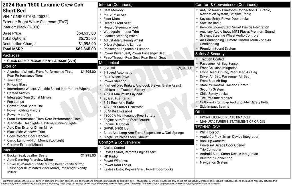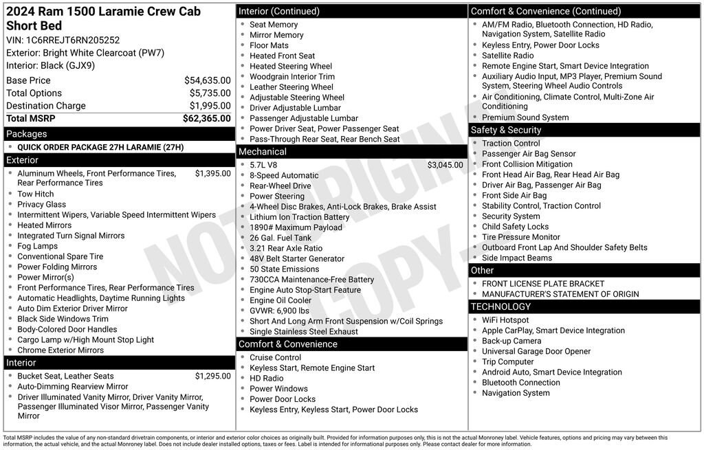 2024 Ram 1500 Laramie Bright White Clearcoat Laramie RWD 8-Speed Automatic HEMI 5.7L V8 Multi Displacement VVT eTorque 10 Speakers, 3 Rear Seat Head Restraints, 3.21 Rear Axle Ratio, 4 Way Front Headrests, 4-Wheel Disc Brakes, 48V Belt Starter Generator, 4G LTE Wi-Fi Hot Spot, ABS brakes, Air Conditioning, Alloy wheels, AM/FM radio: SiriusXM with 360L, Apple CarPlay, Apple CarPlay/Android Auto, Audio memory, Auto-dimming door mirrors, Auto-Dimming Exterior Driver Mirror, Auto-dimming Rear-View mirror, Automatic temperature control, Brake assist, Bumpers: chrome, Chrome Exterior Mirrors, Compass, Connected Travel & Traffic Services, Connectivity - US/Canada, Convex Wide-Angle Exterior Mirror Insert, Delay-off headlights, Driver door bin, Driver Seat Memory, Driver vanity mirror, Dual front impact airbags, Dual front side impact airbags, Electronic Stability Control, Exterior Mirrors Courtesy Lamps, Exterior Mirrors w/Heating Element, Exterior Mirrors w/Memory, Exterior Mirrors w/Supplemental Signals, Exterior Parking Camera Rear, For Details, Visit DriveUconnect.com, For More Info, Call 800-643-2112, Front anti-roll bar, Front Center Armrest w/Storage, Front dual zone A/C, Front fog lights, Front License Plate Bracket, Front reading lights, Front Seat Back Map Pockets, Front wheel independent suspension, Fully automatic headlights, Garage door transmitter, Global Telematics Box Module (TBM), Google Android Auto, GPS Navigation, HD Radio, Heated door mirrors, Heated Front Seats, Heated front seats, Heated Steering Wheel, Heated steering wheel, Illuminated entry, Integrated Voice Command w/Bluetooth, Leather steering wheel, Leather Trim 40/20/40 Bench Seat, Low tire pressure warning, Manufacturer's Statement of Origin, Memory seat, Navigation System, Occupant sensing airbag, Outside temperature display, Overhead airbag, Overhead console, Panic alarm, Passenger door bin, Passenger vanity mirror, Power 2-Way Driver Lumbar Adjust, Power 2-Way Passenger Lumbar Adjust, Power 8-Way Driver & Passenger Seats, Power door mirrors, Power driver seat, Power passenger seat, Power steering, Power windows, Power-Folding Mirrors, Quick Order Package 27H Laramie, Radio data system, Radio: Uconnect 5 Nav w/8.4 Display, RAM Grille Badge - Chrome, Rear 60/40 Folding Seat, Rear anti-roll bar, Rear seat center armrest, Rear step bumper, Remote keyless entry, Security system, SiriusXM Radio Service, SiriusXM w/360L, Speed control, Split folding rear seat, Steering wheel mounted audio controls, Tachometer, Telescoping steering wheel, Tilt steering wheel, Traction control, Trip computer, Turn signal indicator mirrors, Variably intermittent wipers, Ventilated Front Seats, Ventilated front seats, Voltmeter, Wheels: 18 x 8 Aluminum Base Painted, Wheels: 20 x 9 Premium Paint/Polished.