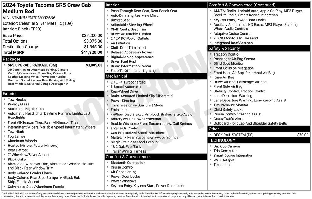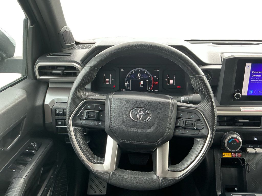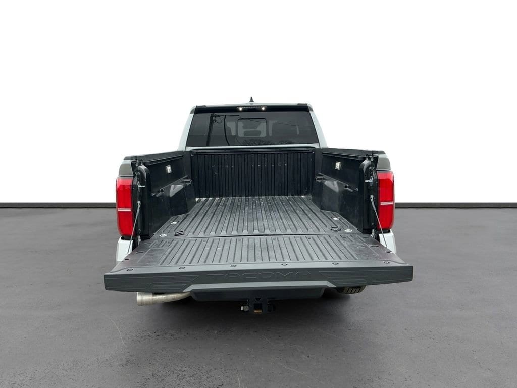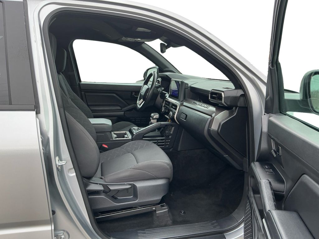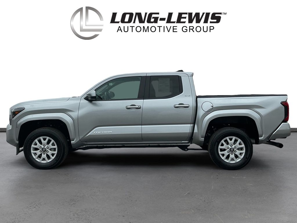 2024 Toyota Tacoma Silver RWD 8-Speed Automatic 2.4L 4-Cylinder 3.583 Axle Ratio, 4-Wheel Disc Brakes, 6 Speakers, ABS brakes, Air Conditioning, Alloy wheels, AM/FM radio: SiriusXM, Anti-whiplash front head restraints, Apple CarPlay/Android Auto, Auto High-beam Headlights, Auto-dimming Rear-View mirror, Brake assist, Bumpers: body-color, Driver door bin, Dual front impact airbags, Dual front side impact airbags, Electronic Stability Control, Emergency communication system: Safety Connect (1-year trial), Exterior Parking Camera Rear, Four wheel independent suspension, Front anti-roll bar, Front Bucket Seats, Front Center Armrest, Front fog lights, Front reading lights, Fully automatic headlights, Heated door mirrors, Illuminated entry, Knee airbag, Low tire pressure warning, Occupant sensing airbag, Outside temperature display, Overhead airbag, Overhead console, Panic alarm, Passenger door bin, Power door mirrors, Power steering, Power windows, Radio: 8 Toyota Audio Multimedia, Rear step bumper, Rear window defroster, Remote keyless entry, Speed control, Speed-sensing steering, Split folding rear seat, Steering wheel mounted audio controls, Tachometer, Telescoping steering wheel, Tilt steering wheel, Traction control, Trip computer, Variably intermittent wipers.